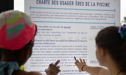 En nage ! est un projet artistique participatif qui a permis aux habitant.es de Pierrefitte-sur-Seine de découvrir et pratiquer la piscine autrement : par le jeu, la convivialité, la fête, mais aussi à travers des ateliers sur la relation à l’eau, sur les besoins et la façon dont l’équipement peut y répondre.