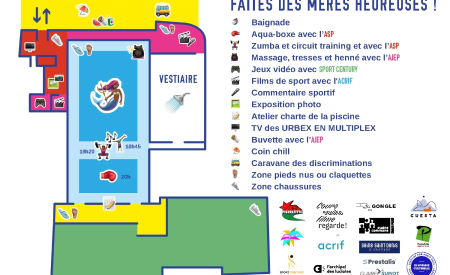 La fête des mères est une occasion spéciale de les célébrer et prendre soin d’elles. Au centre aquatique, elles sont souvent accompagnantes, elles préparent et rendent possible la baignade pour les enfants et les jeunes mais profitent rarement des espaces pour elles. Avec l’aide des forces vives locales, nous avons conçu une programmation sur mesure pour permettre aux mamans de souffler : des activités dédiées aux enfants et aux jeunes (jeux, e-sport), des séances sportives et des ateliers bien-être spécialement pour elles (massages, tresses), des films sur l’eau et le sport à commenter en direct, une guinguette !