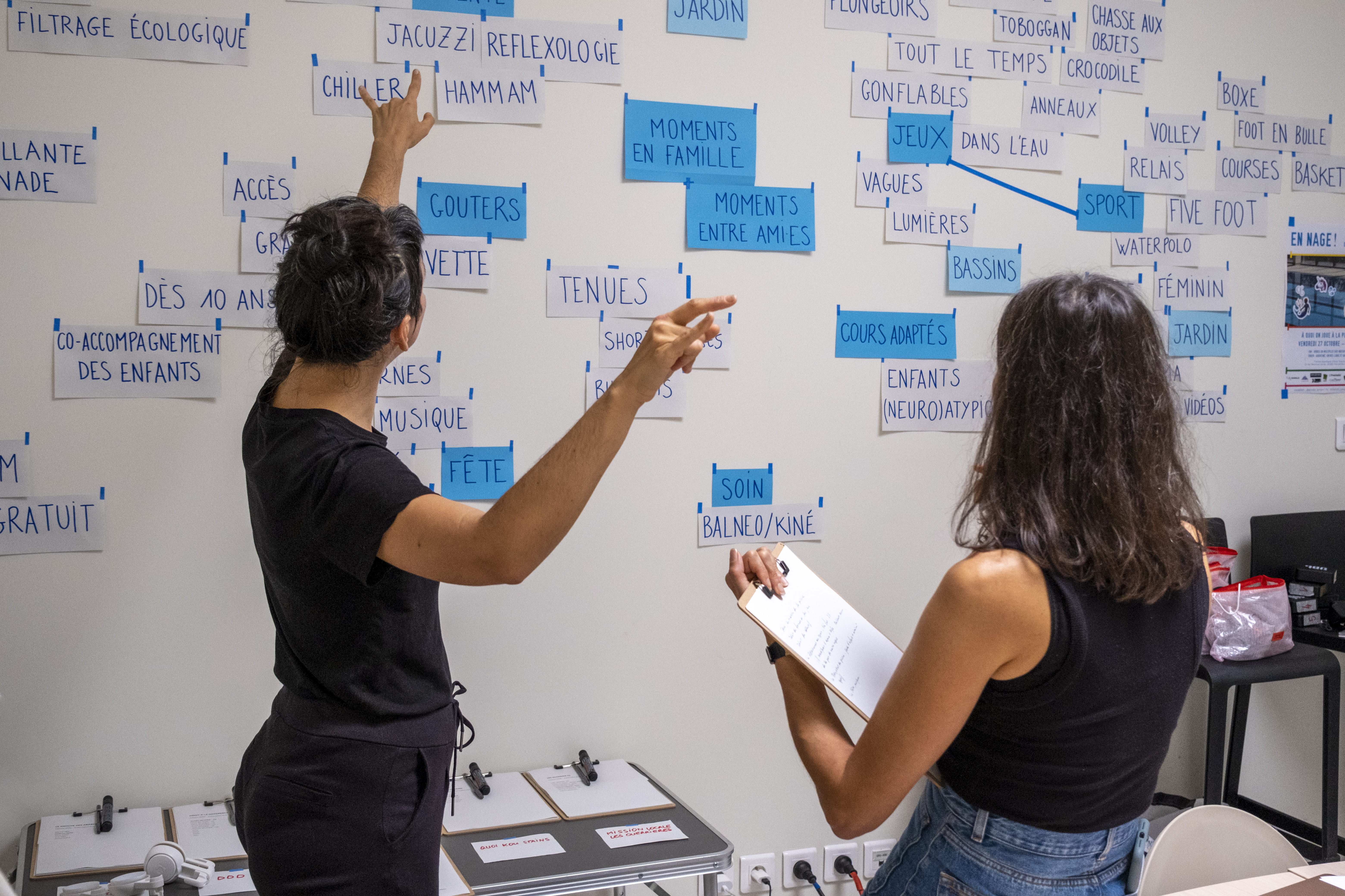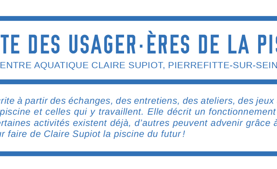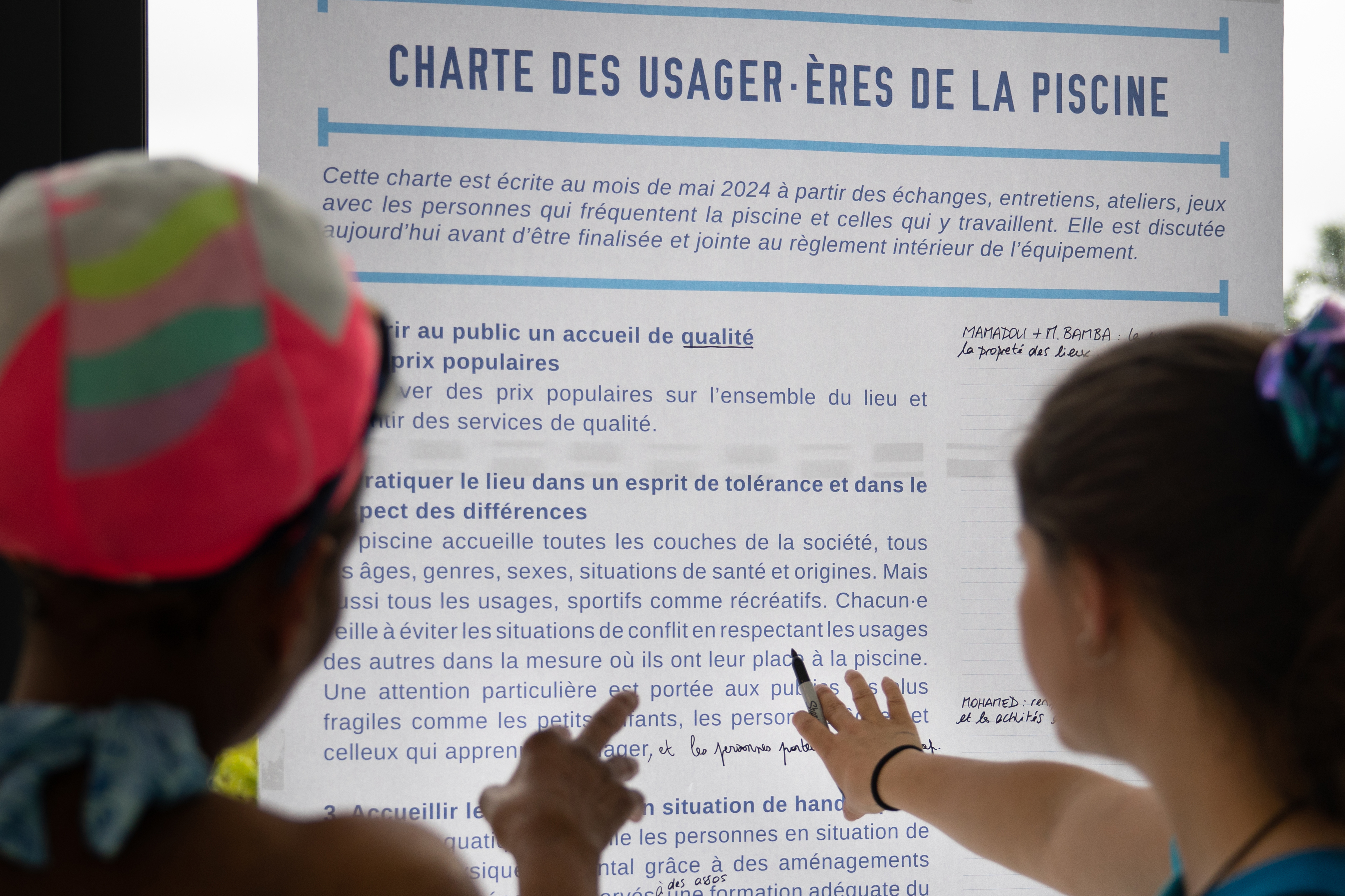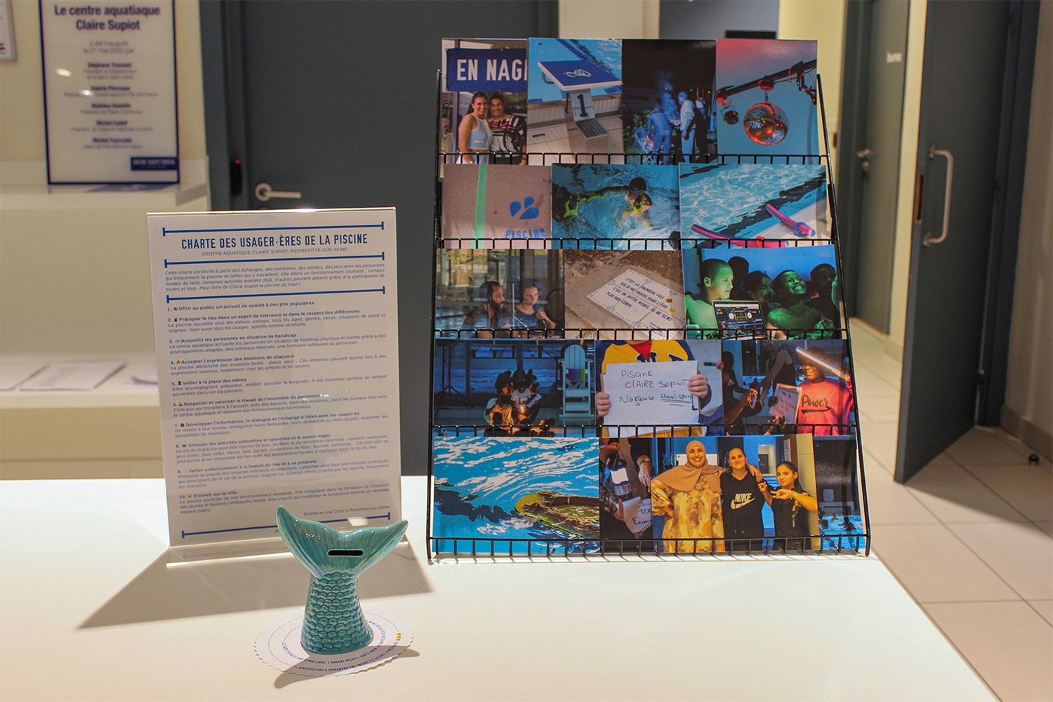 Les temps d’ateliers, de fêtes ont nourri l’ébauche d’une charte des usager.es de la piscine. Discutée et ajustée avec le personnel du centre aquatique, elle est formalisée et affichée dans le hall d’accueil. Elle existe aussi sous la forme d’un jeu de la piscine du futur : jeu de coopération qui permet de poursuivre les échanges autour des grandes thématiques abordées tout au long du projet (accessibilité, place des femmes, des personnes en situation de handicap, des jeunes, nouveaux usages, convivialité, …). Cette édition nourrit les suites du projet au centre aquatique de Pierrefitte et peut inspirer les piscines du territoire.
