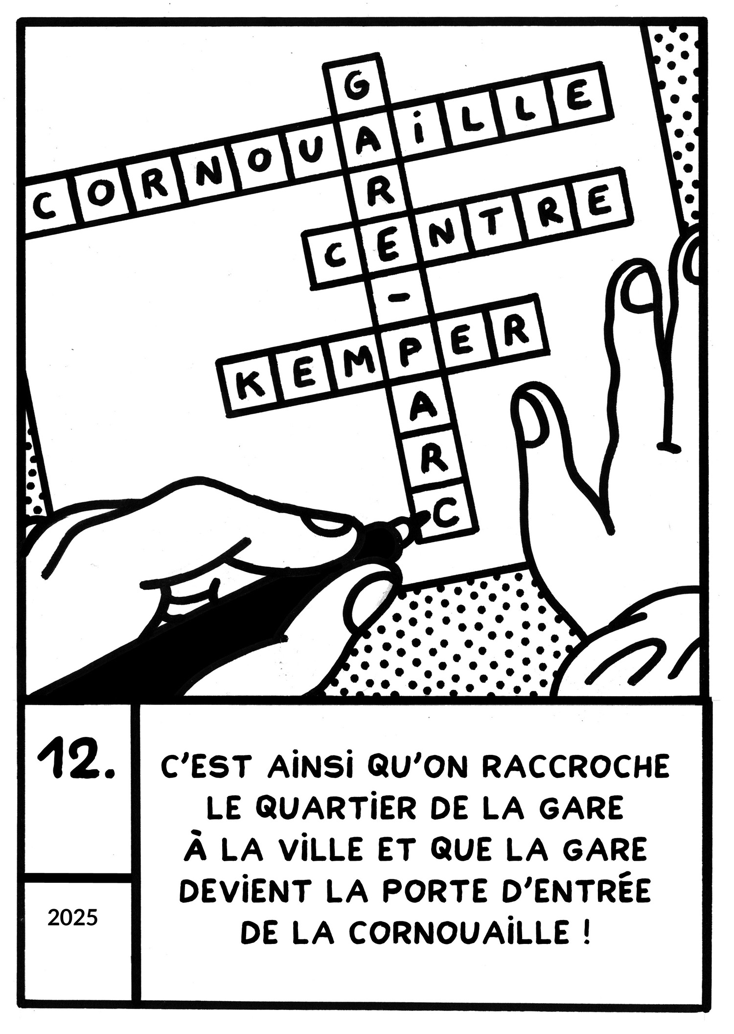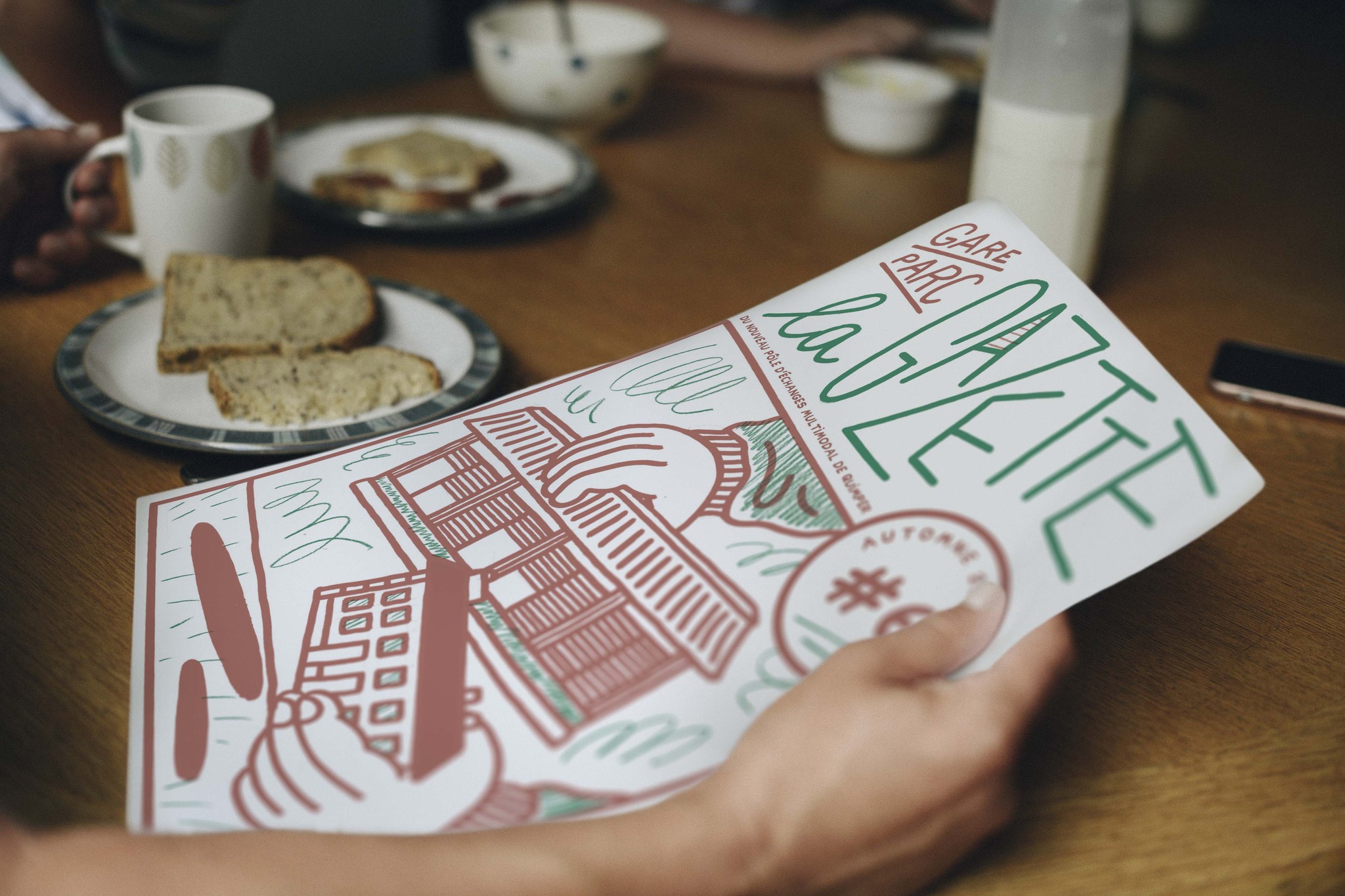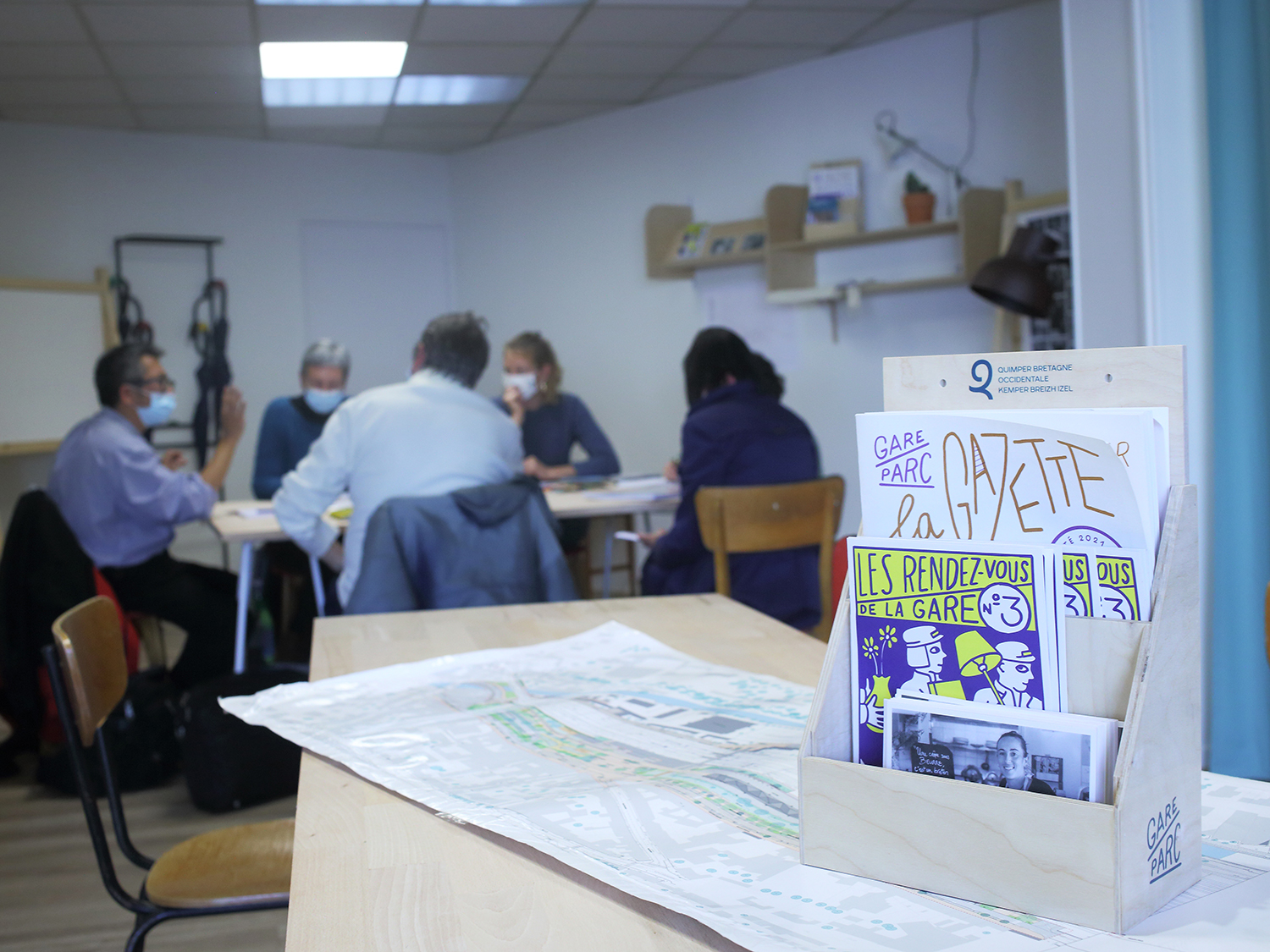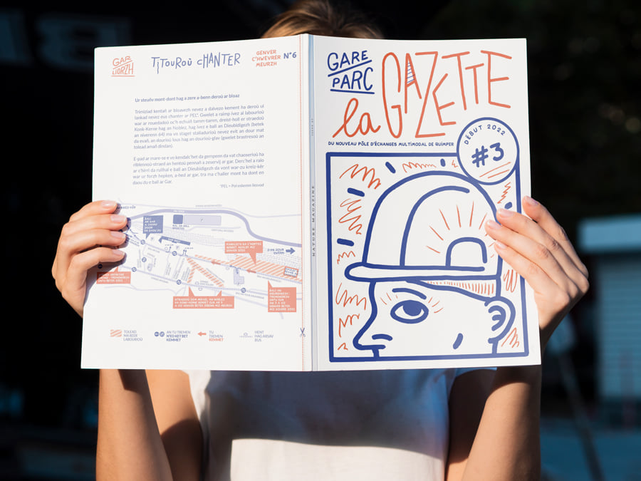 Avec notre partenaire A vrai dire la ville, nous jouons le rôle d’agent de liaison entre tous les acteurs qui gravitent autour de ce projet complexe : habitants, voyageurs, architectes, artistes, maitres d’ouvrage et partenaires (l’Union européenne, l’État, la Région Bretagne, le Conseil Départemental du Finistère, SNCF Gares&connexions, SNCF Réseau). C’est par nous que transite l’information sur le projet et son calendrier. Nous avons souhaité casser les codes de l’information travaux très institutionnelle en imaginant une identité graphique, un mode d’adresse et des outils simples qui rendent le projet accessible et joyeux. La Gazette, journal de bord du projet Gare-Parc, est diffusée deux fois par an. Elle informe sur le projet, les résidences artistiques et les actions menées dans le quartier. Elle est distribuée dans les boites aux lettres des riverains mais aussi chez les commerçants du quartier dans des présentoirs en bois spécialement conçus à cet effet. Outre ces éditions collectors et le compte FB du projet, le tableau de bord permet de centraliser les informations sur le projet Gare-Parc dans l’espace public sur le parvis de la gare.