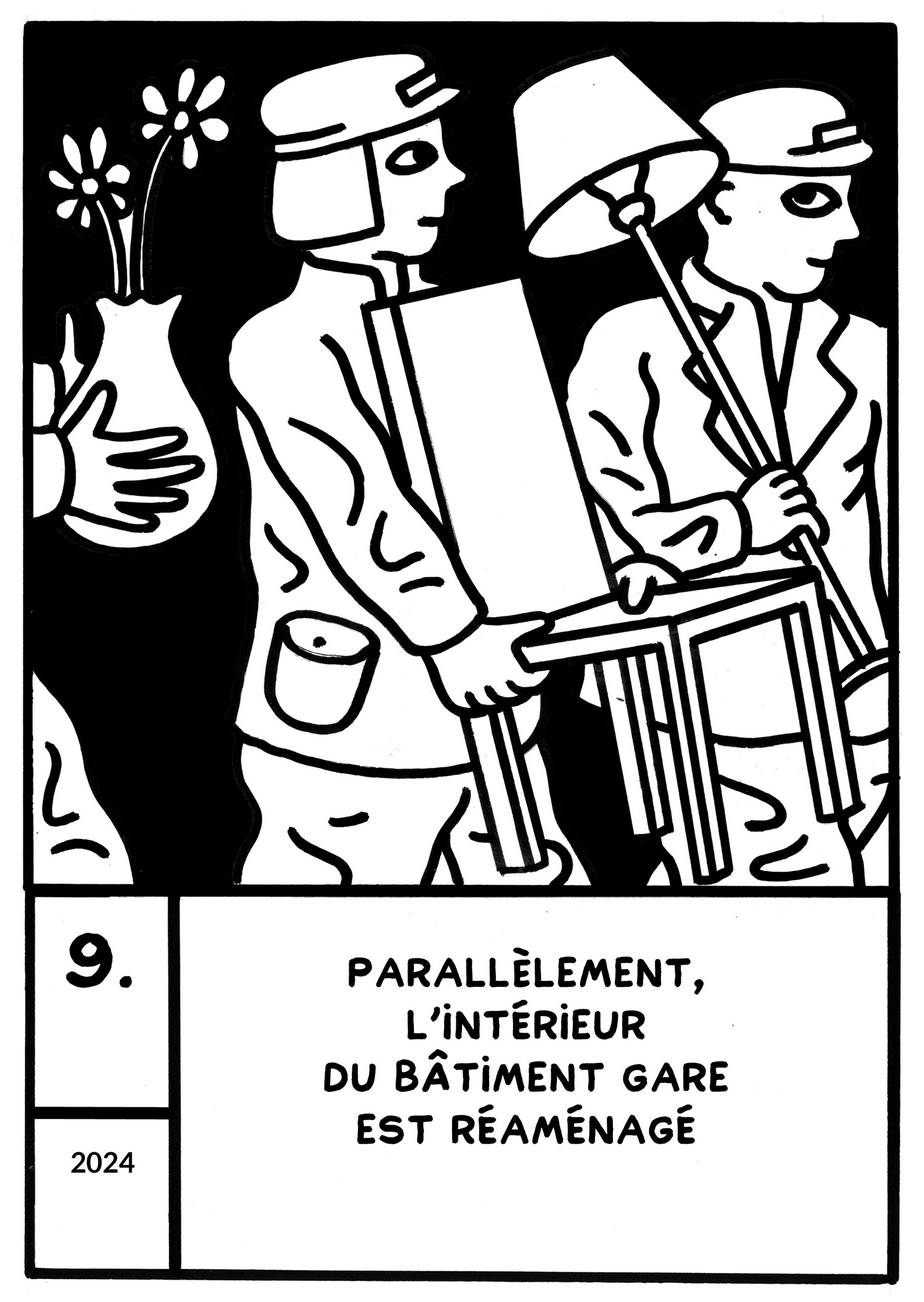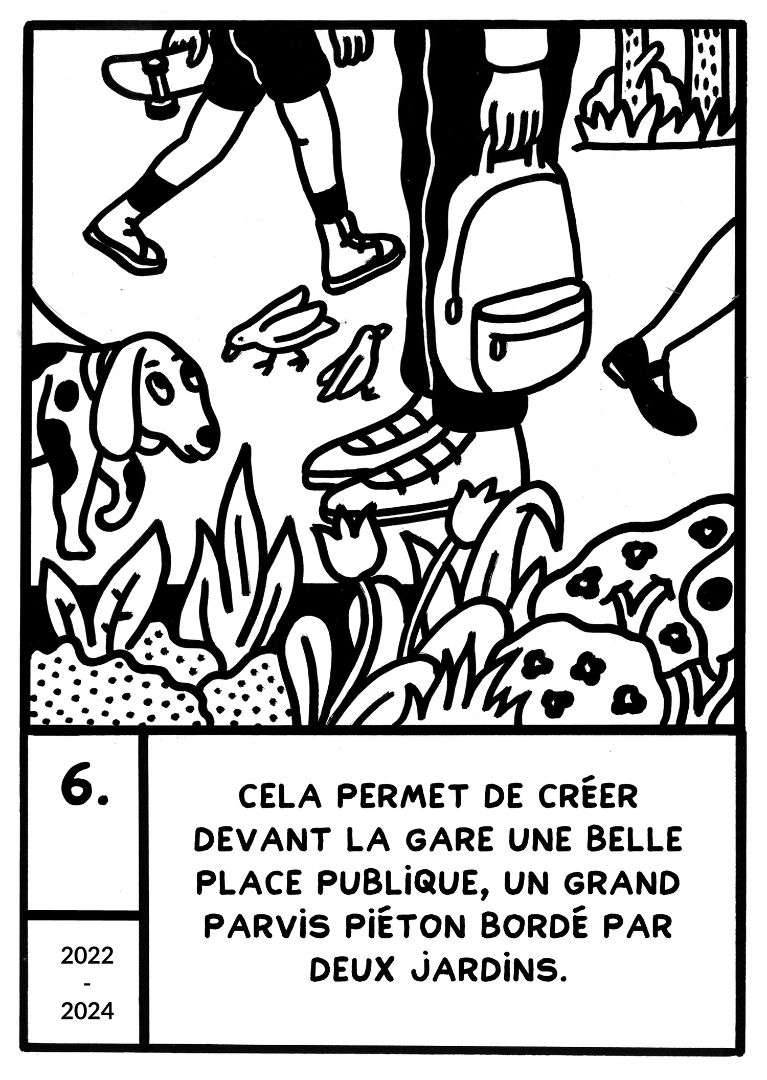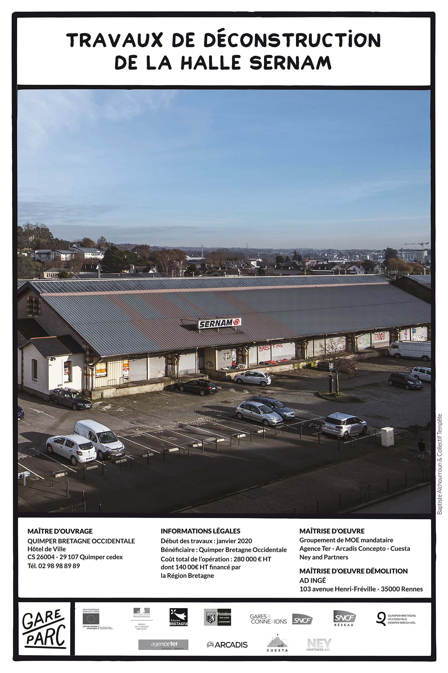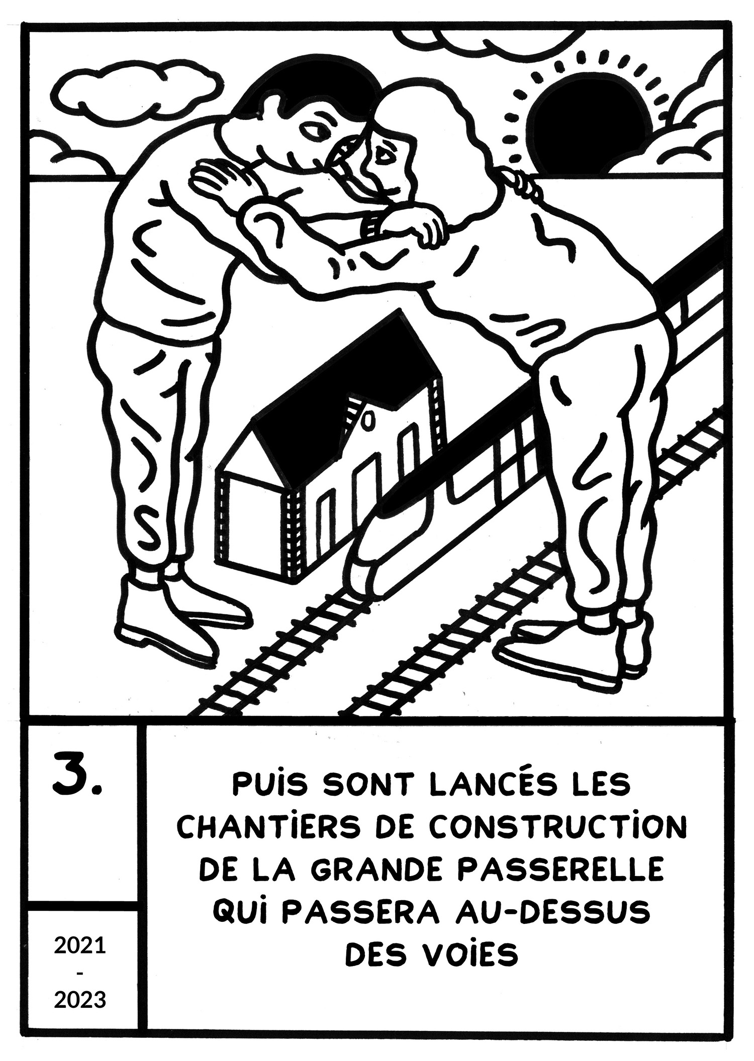 Avec notre partenaire A vrai dire la ville, nous jouons le rôle d’agent de liaison entre tous les acteurs qui gravitent autour de ce projet complexe : habitants, voyageurs, architectes, artistes, maitres d’ouvrage et partenaires (l’Union européenne, l’État, la Région Bretagne, le Conseil Départemental du Finistère, SNCF Gares&connexions, SNCF Réseau). C’est par nous que transite l’information sur le projet et son calendrier. Nous avons souhaité casser les codes de l’information travaux très institutionnelle en imaginant une identité graphique, un mode d’adresse et des outils simples qui rendent le projet accessible et joyeux. La Gazette, journal de bord du projet Gare-Parc, est diffusée deux fois par an. Elle informe sur le projet, les résidences artistiques et les actions menées dans le quartier. Elle est distribuée dans les boites aux lettres des riverains mais aussi chez les commerçants du quartier dans des présentoirs en bois spécialement conçus à cet effet. Outre ces éditions collectors et le compte FB du projet, le tableau de bord permet de centraliser les informations sur le projet Gare-Parc dans l’espace public sur le parvis de la gare.