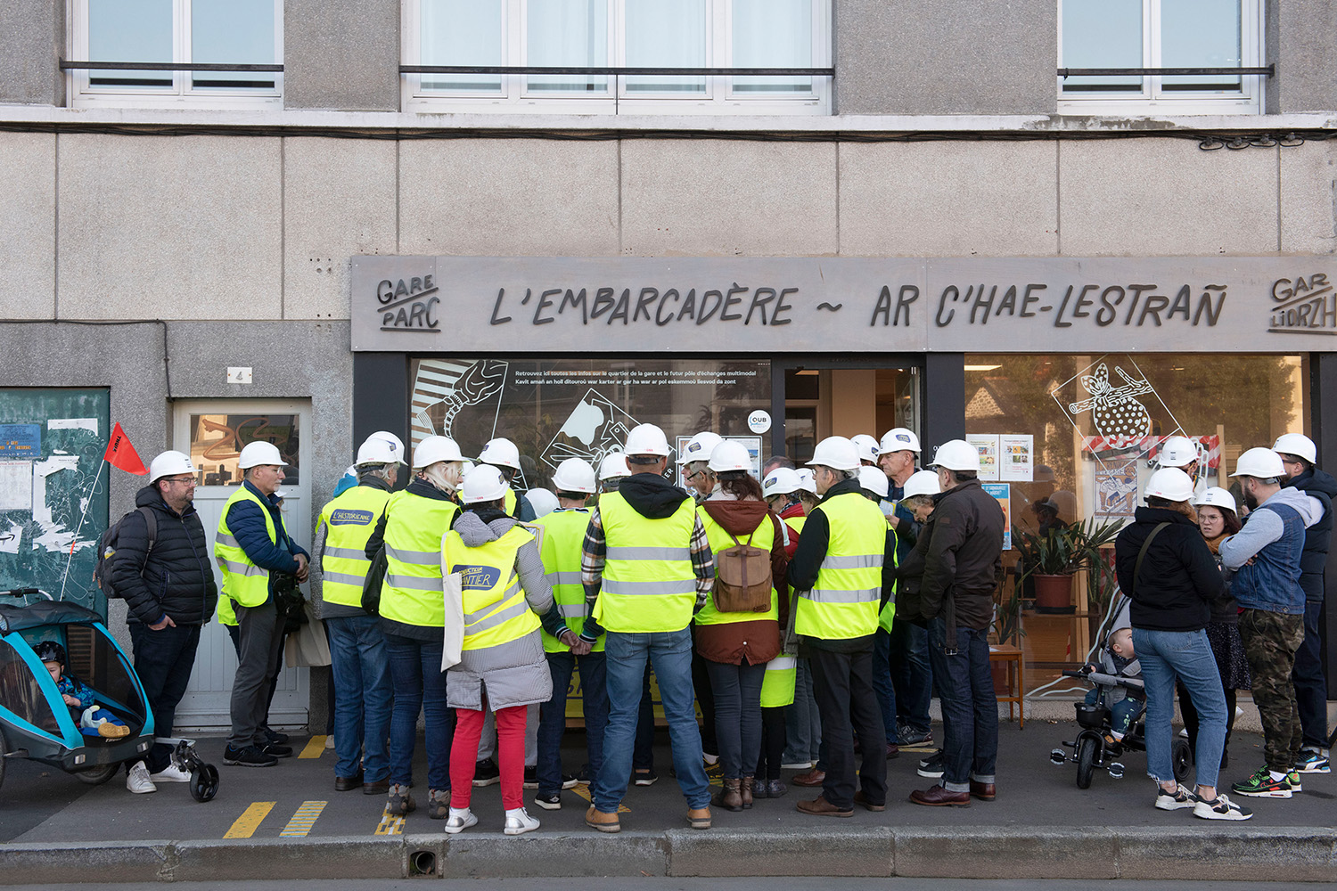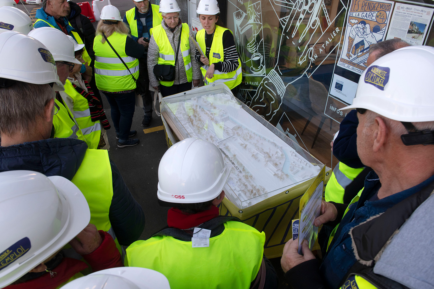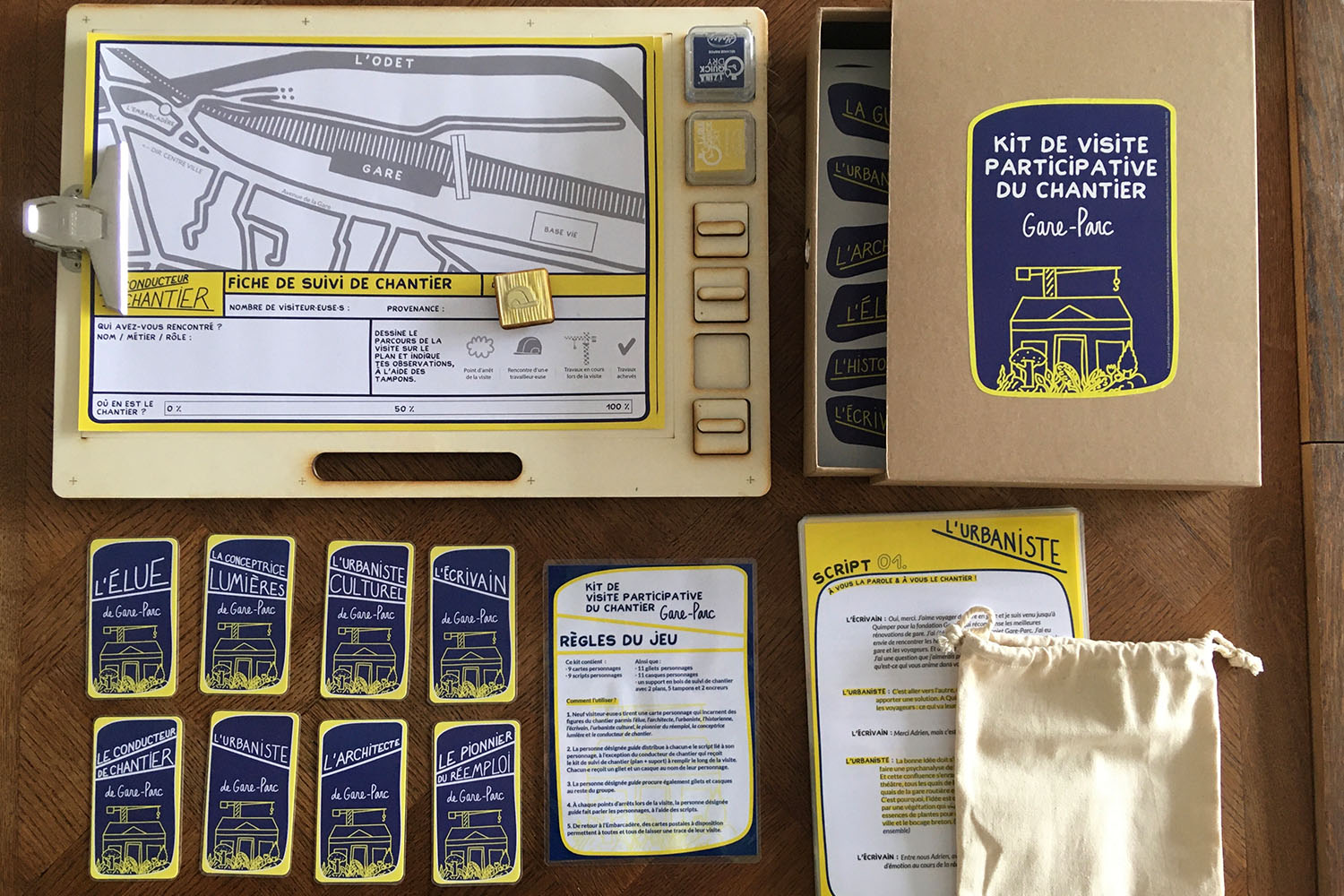 Dans le cas présent, le kit de visite de chantier participative propose aux participants d’endosser un rôle parmi les personnages de ce projet urbain d’envergure. Les règles du jeu sont simples : au début de la visite, les participant.e.s sont invité.e.s à piocher une carte personnage, mettre un casque et un gilet jaune floqué puis un script leur est remis. L’architecte de la passerelle, l’urbaniste, le concepteur lumière, l’ingénieur.e, l’historien.ne, l’urbaniste culturel, le conducteur de chantier, l’élu.e ou bien encore l’écrivain : tout le monde est là ? La visite de chantier peut commencer ! Les participant.e.s sont à la fois parties prenantes et animateurs.trices de cette visite pas comme les autres.