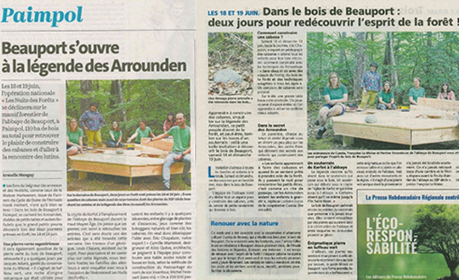 Une première activation se déroule pendant les Nuits des forêts, ces expériences artistiques qui ont lieu dans 150 forêts partout en France pour sensibiliser aux enjeux forestiers et promouvoir de nouveaux rapports au vivant. Soixante-cinq constructeurs, petits et grands, se pressent dans le Bois de Beauport pour participer au concours de construction de cabanes ! Les pierres vertes découvertes sous terre sont accrochées par les enfants à l’entrée des cabanes, comme une invitation.
