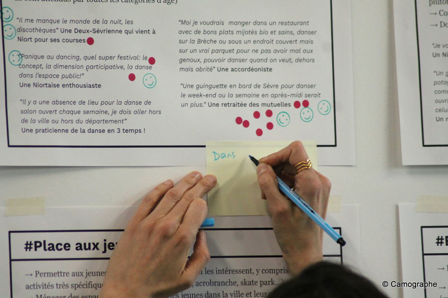 Pour recueillir les pratiques quotidiennes et culturelles des habitants, un questionnaire a été mis en place sur chaque territoire pour connaître les loisirs et pratiques culturelles des habitants et interroger les manques qui pourraient exister. Il a été mis en ligne et diffusé par de multiples canaux, tant numériques que de terrain (présence sur les marchés, arpentage des villes, ateliers hors les murs…). L’objectif était bien de pouvoir quadriller le territoire et aller au plus près des habitants pour recueillir leur parole. A Niort, nous avons eu la chance de collaborer avec les étudiants Licence 2 Info-comm avec qui nous avons réalisé des micros-trottoirs sur l’espace public. A Guichen, nous avons fait vivre l’enquête sur les ondes en imaginant avec notre partenaire Radio laser des émissions sur les défis de la ville.
