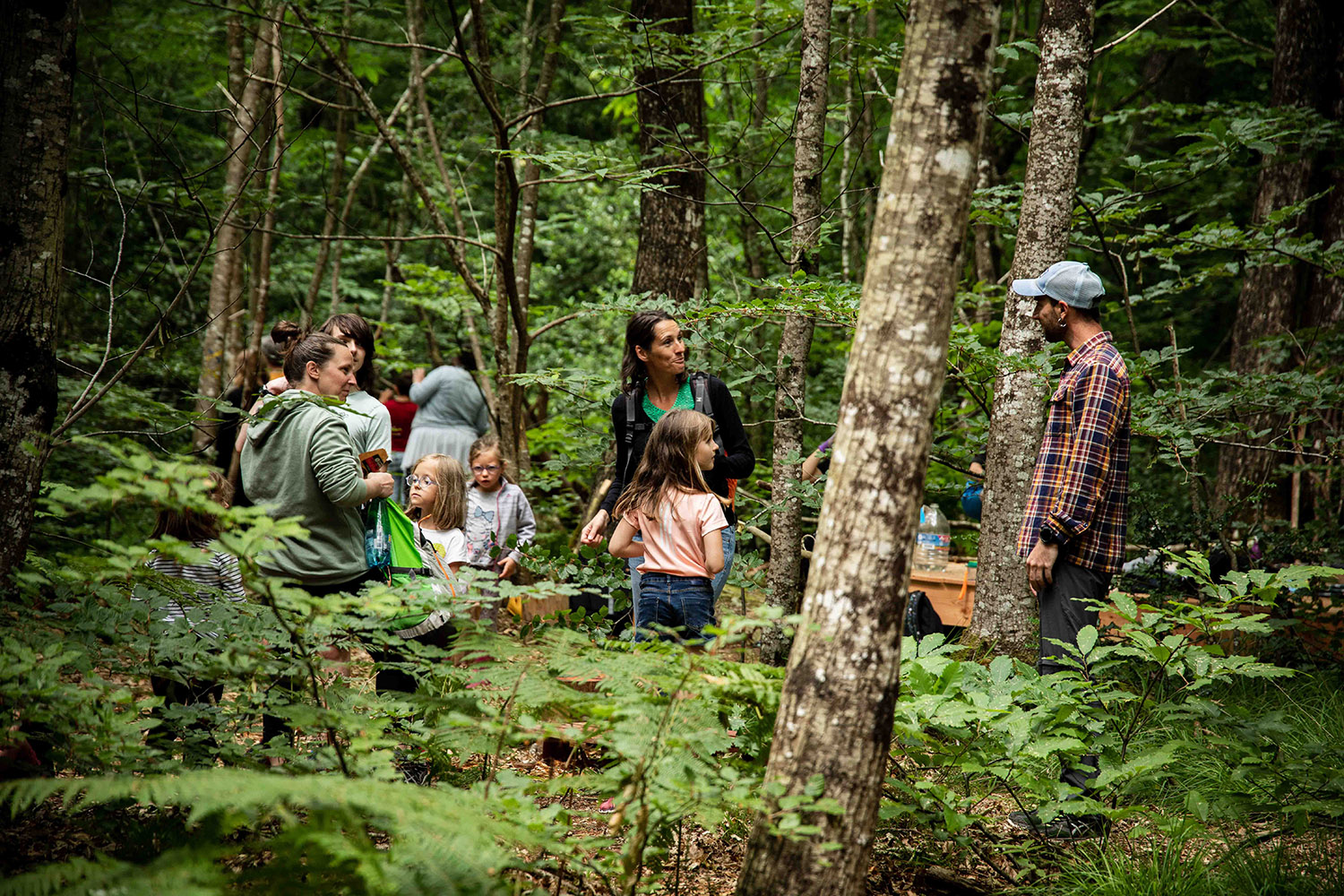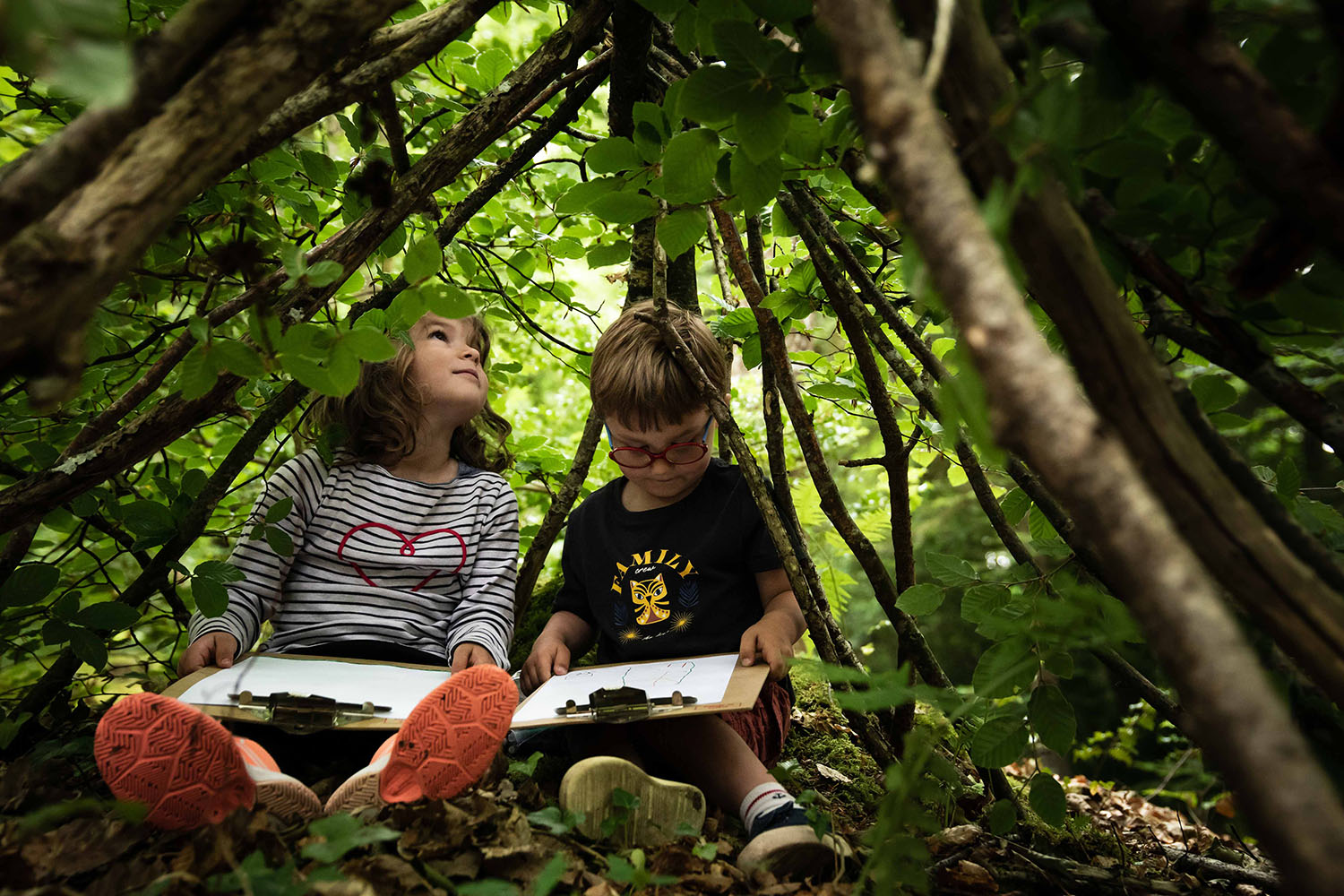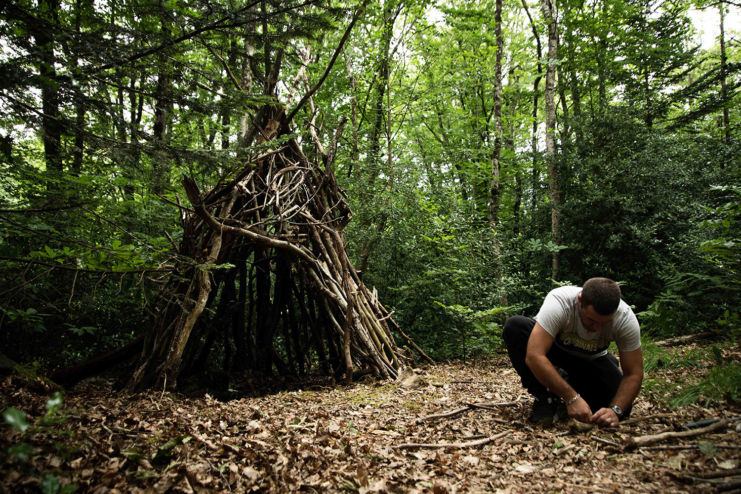 Une première activation se déroule pendant les Nuits des forêts, ces expériences artistiques qui ont lieu dans 150 forêts partout en France pour sensibiliser aux enjeux forestiers et promouvoir de nouveaux rapports au vivant. Soixante-cinq constructeurs, petits et grands, se pressent dans le Bois de Beauport pour participer au concours de construction de cabanes ! Les pierres vertes découvertes sous terre sont accrochées par les enfants à l’entrée des cabanes, comme une invitation.