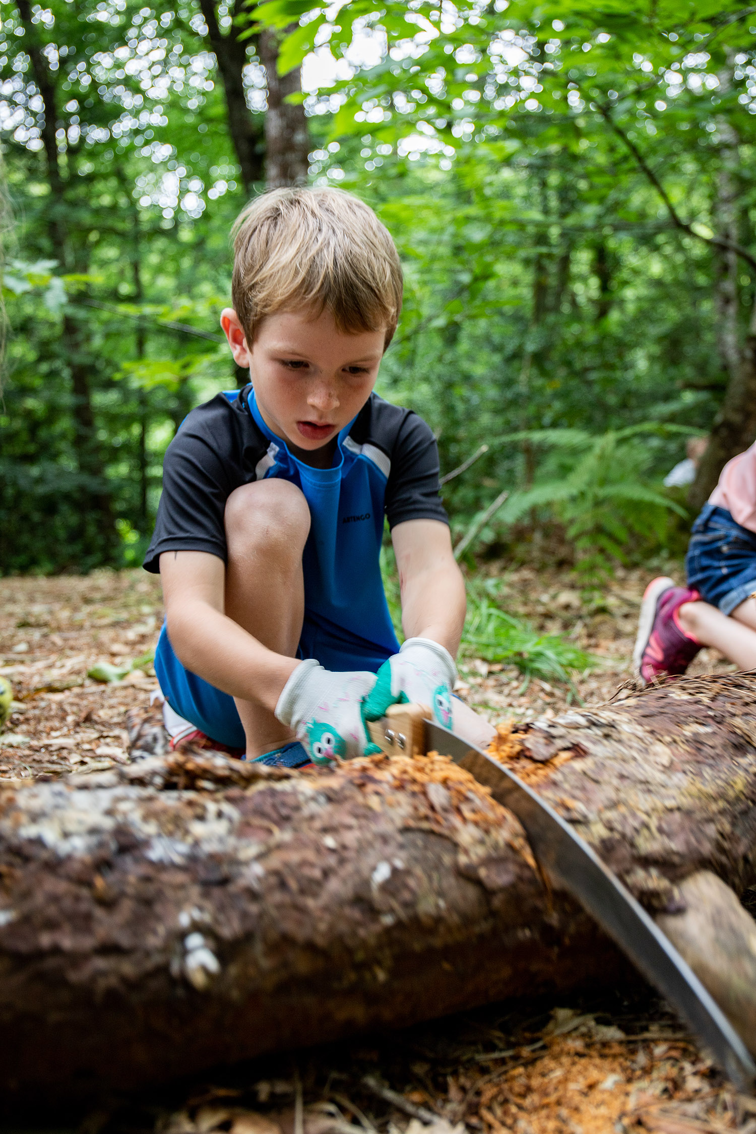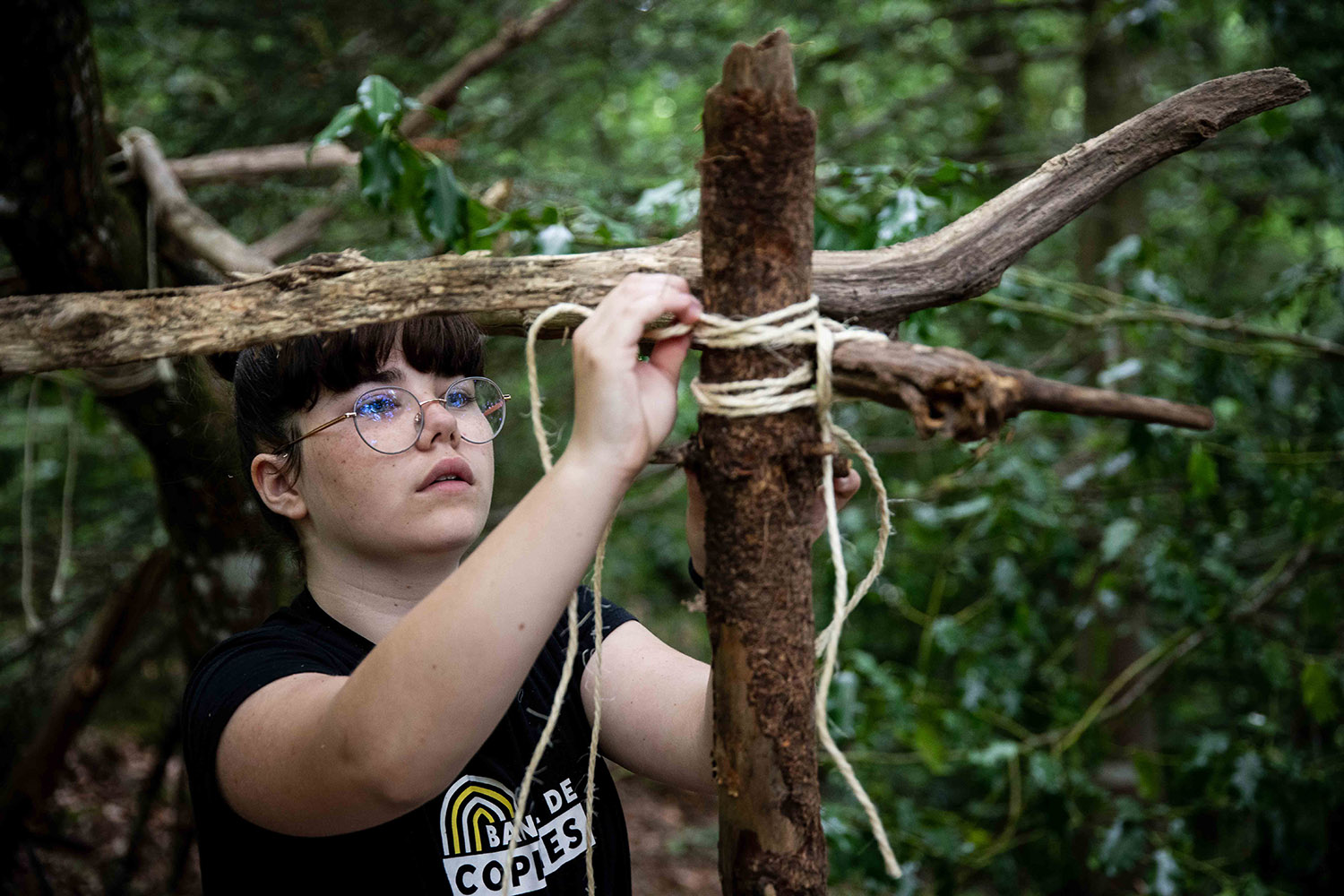 Afin de prolonger l’activation pendant l’été, Éric Chapalain éducateur jeunesse de l’association PARS Nature a formé des animatrices aux techniques de construction et à la manipulation des outils pour qu’elles puissent à leur tour les transmettre aux enfants. Pour accompagner les sorties autonomes en groupe dans la zone cabanes nous avons conçu un kit de construction (matériel, livres, mode d’emploi) à disposition à l’Abbaye ainsi qu’un dépliant pour guider jusqu’au lieu et informer sur les usages du Bois.