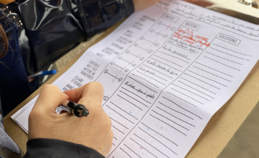 Connaissant le projet d’aménagement dans les moindres détails et bien connectées avec le quartier grâce à notre projet Gare-Parc, nous avons conçu et mis en œuvre une expérimentation inspirée « des marches exploratoires des femmes » et de protocoles des artistes associés de Cuesta, notamment « Plateau-Photo » de GONGLE afin de recueillir des données sensibles sur l’aménagement, mais aussi les modes de gestion et d’animation de ces espaces publics.