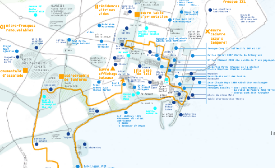 Nous cherchons à faire comprendre par une approche sensible et située les orientations de ce futur programme et imaginons un récit qui le donnera à voir. Nous actons d’un tracé et constituons une carte mêlant œuvres réelles et imaginaires. Avec la direction de la culture et les élus, nous imaginons comment le mettre en œuvre, quel rôle la communauté d’arts publics y jouera, quelles étapes sont à prévoir. Le 13 juillet 2019, nous performons la traversée. Guidés par le documentaliste de l’espace, une partie de la communauté et des habitants sont invités à parcourir en vélo la ville de Saint-Nazaire marquant des étapes pour inaugurer les futures œuvres et en partager les récits.