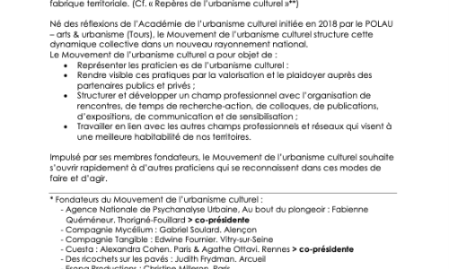 Le 19 décembre 2023, jour de la Saint Urbain, les membres fondateurs du Mouvement de l’urbanisme culturel se sont réunis, en marge de la ZAT de Montpellier, pour se constituer en association loi 1901. Né des réflexions de l’Académie de l’urbanisme culturel initiée en 2018 par le POLAU – arts & urbanisme (Tours), le Mouvement de l’urbanisme culturel structure cette dynamique collective dans un nouveau rayonnement national.