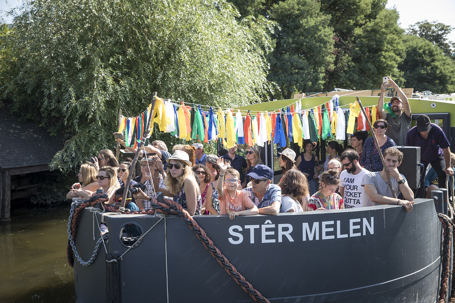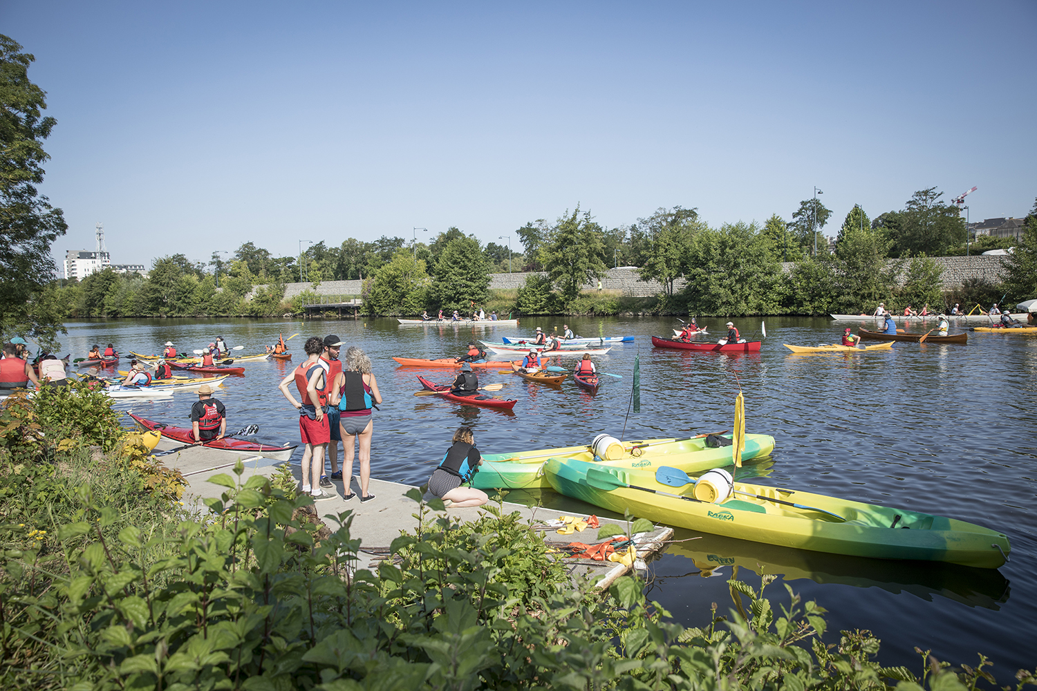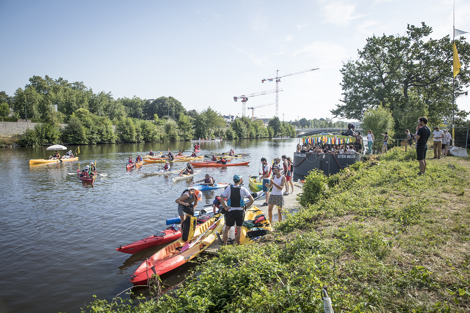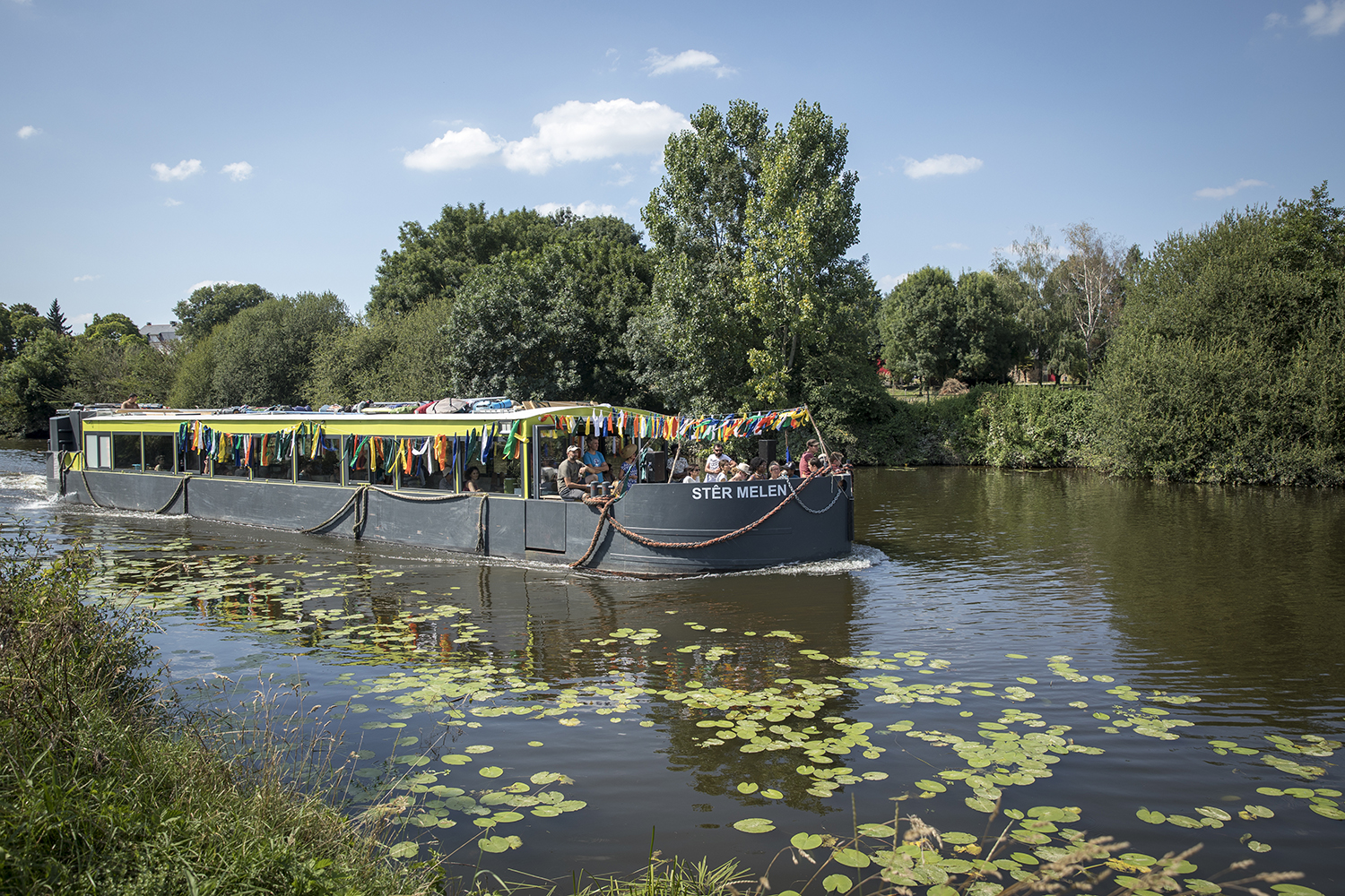 Au départ de Baud-Chardonnet, futur nouveau quartier rennais aux allures de plage verte, nous avons embarqué à bord d’une péniche rejointe par un équipage de canoës, kayaks, toues et bateaux en tout genre. Une journée au rythme des écluses, bercés par les récits d’Alexis Fichet lus par Microsillons et le parfum d’un repas concocté avec l’aide des passagers par la scénographe culinaire Alexandra Vincens. Découvrir la Vallée depuis l’eau pour imaginer ensemble ce que pourrait être un fleuve beaucoup plus navigué et navigable. Pour nous y aider, cinq haltes nautiques ont été prototypées par Léa Muller-Itinérances et la plasticienne Sophie Cardin. Le soir nous avons retrouvé notre banquet sous les étoiles sur le site de la Corbinais à Laillé, dans la très belle scénographie de Bureau Cosmique.