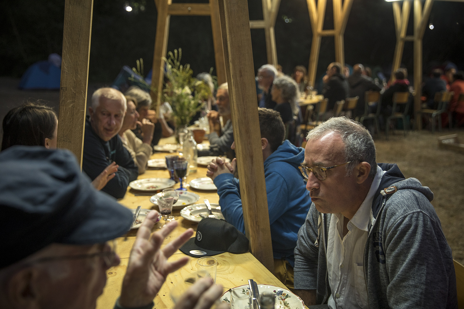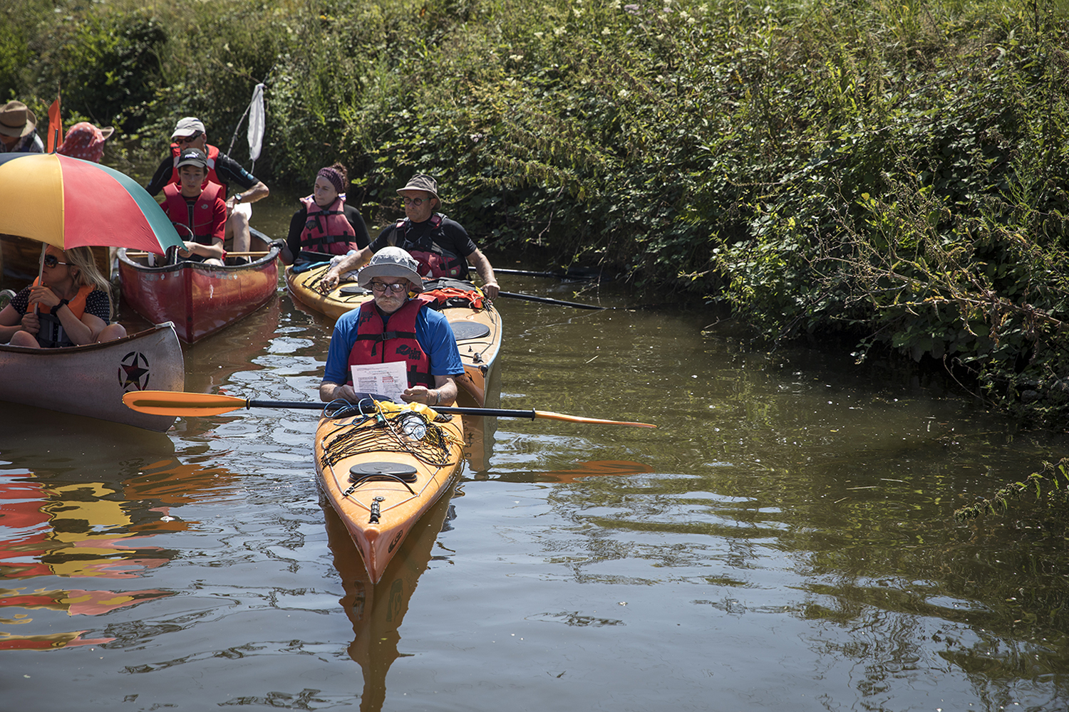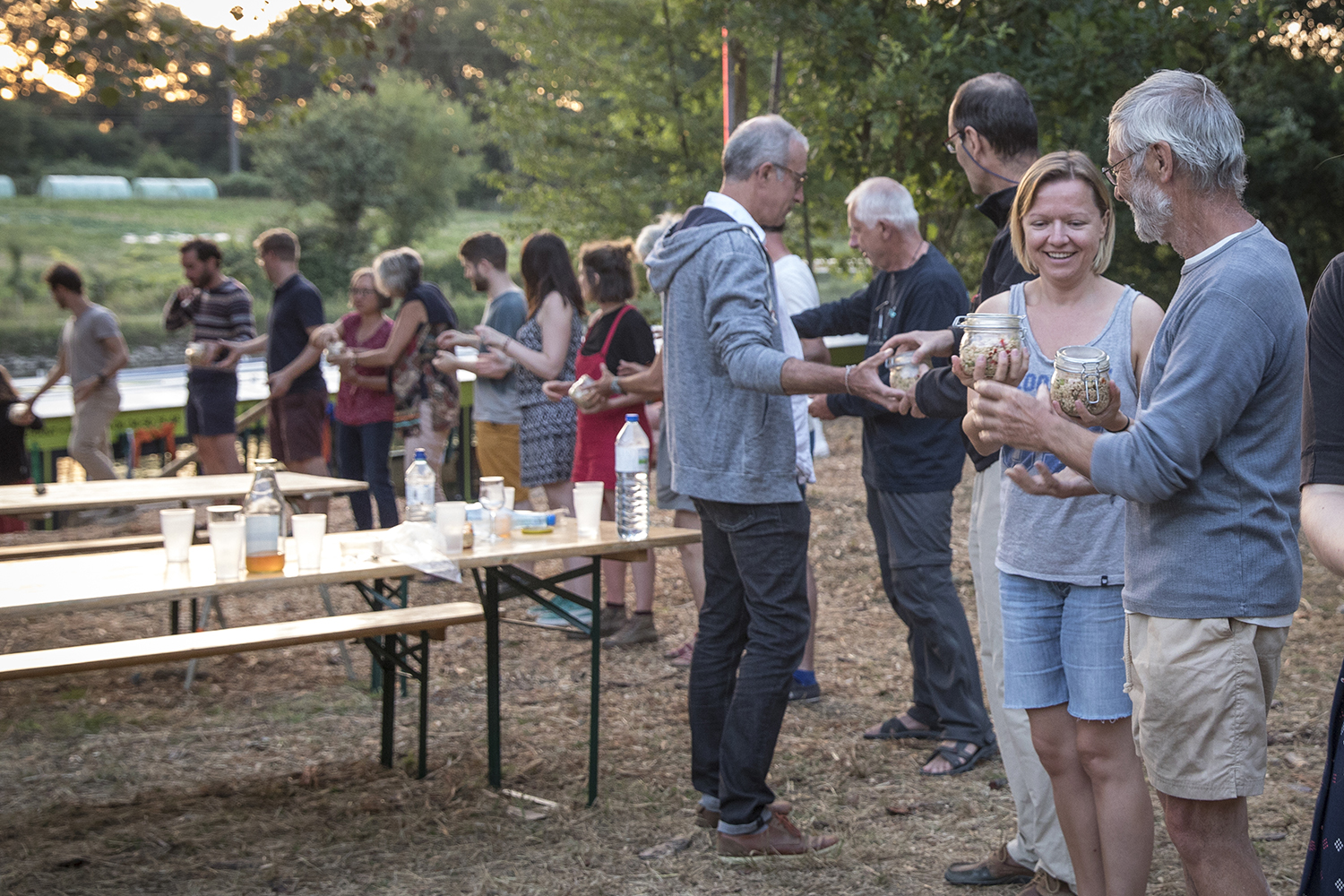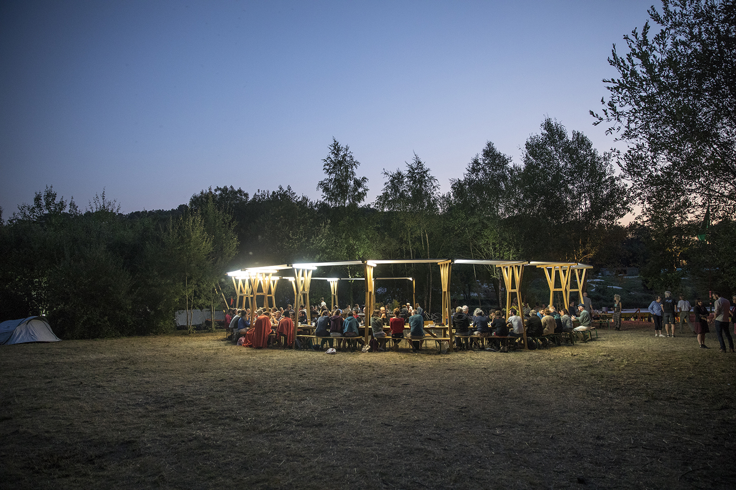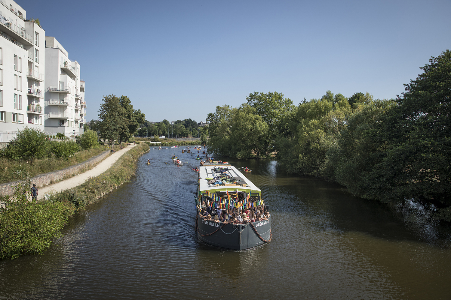 Au départ de Baud-Chardonnet, futur nouveau quartier rennais aux allures de plage verte, nous avons embarqué à bord d’une péniche rejointe par un équipage de canoës, kayaks, toues et bateaux en tout genre. Une journée au rythme des écluses, bercés par les récits d’Alexis Fichet lus par Microsillons et le parfum d’un repas concocté avec l’aide des passagers par la scénographe culinaire Alexandra Vincens. Découvrir la Vallée depuis l’eau pour imaginer ensemble ce que pourrait être un fleuve beaucoup plus navigué et navigable. Pour nous y aider, cinq haltes nautiques ont été prototypées par Léa Muller-Itinérances et la plasticienne Sophie Cardin. Le soir nous avons retrouvé notre banquet sous les étoiles sur le site de la Corbinais à Laillé, dans la très belle scénographie de Bureau Cosmique.