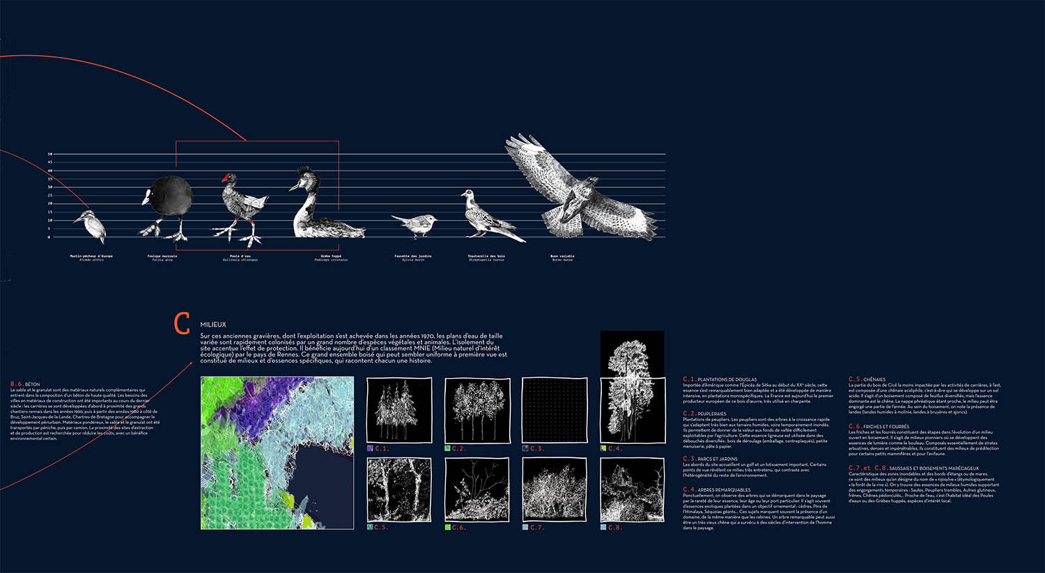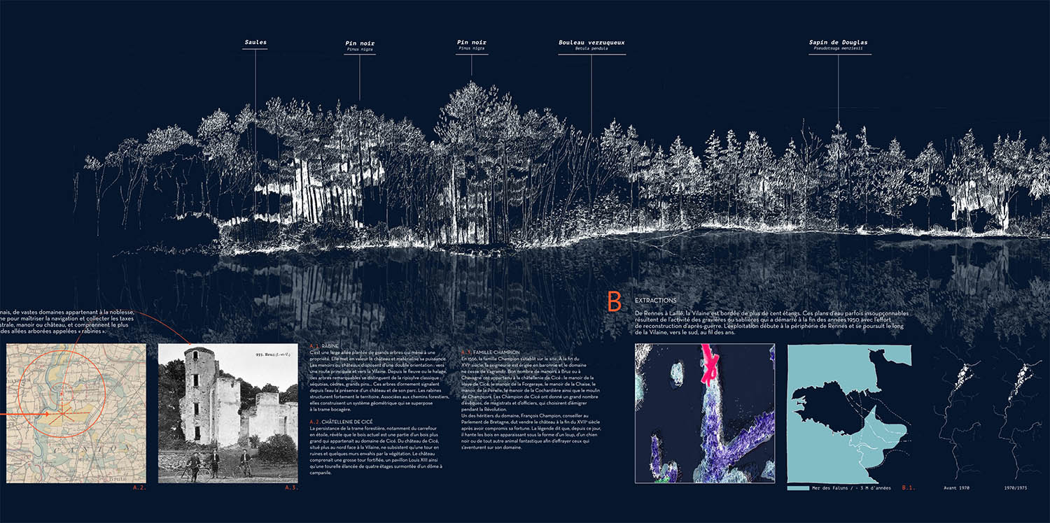 Pour se diriger et se renseigner sur la Vallée de la Vilaine, une signalétique de projet conçue par l’Agence Ter et 24 Avril permet de baliser les chemins, d’orienter les promeneurs. A côté de ces premières fonctions, nous avons imaginé avec la paysagiste Léa Muller-Itinérances des « révélateurs » qui favorisent, site par site, une approche sensible du lieu et de ses enjeux à travers de grands panneaux narratifs illustrés, les géo-récits, et une bande son qui accompagne la découverte du site.