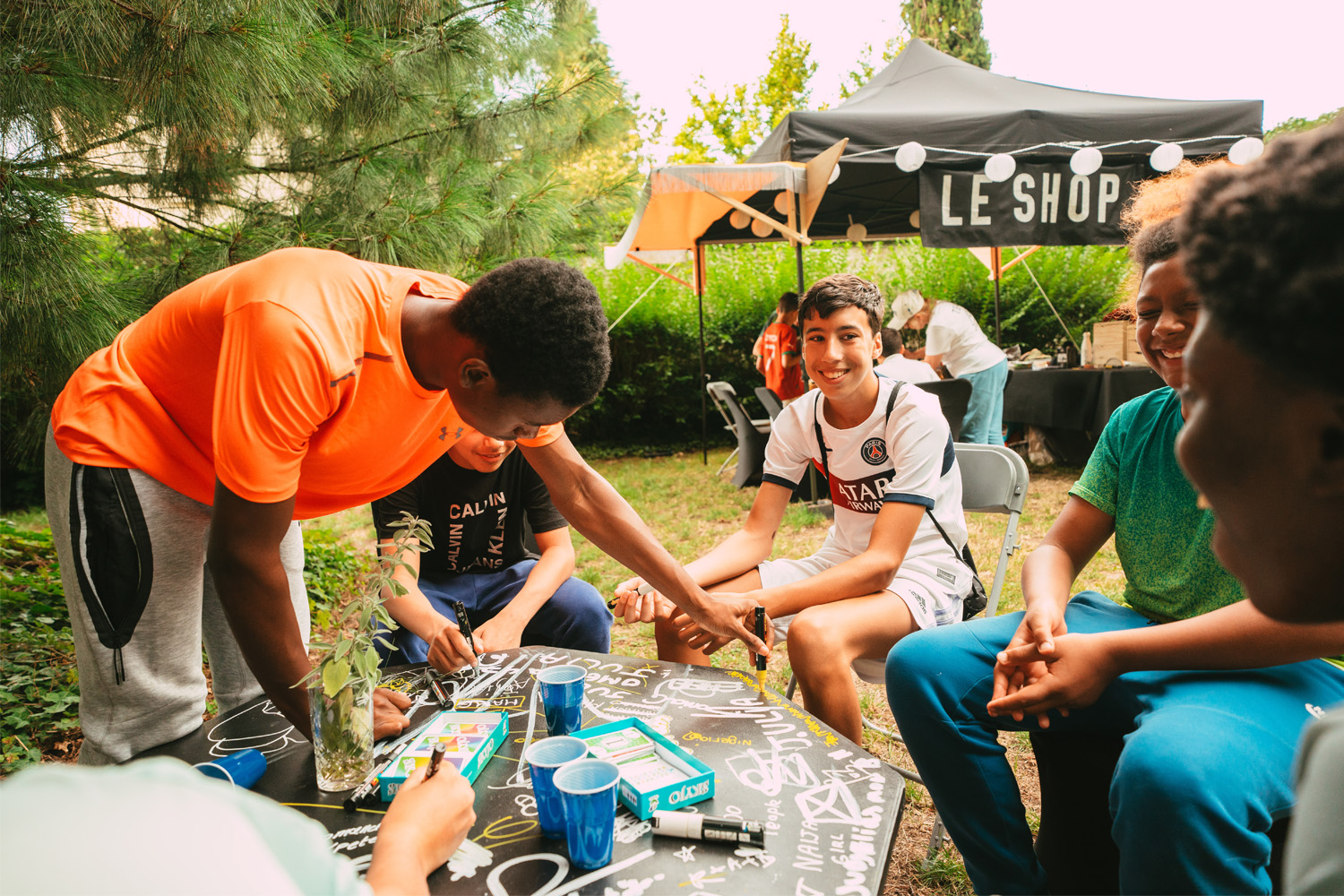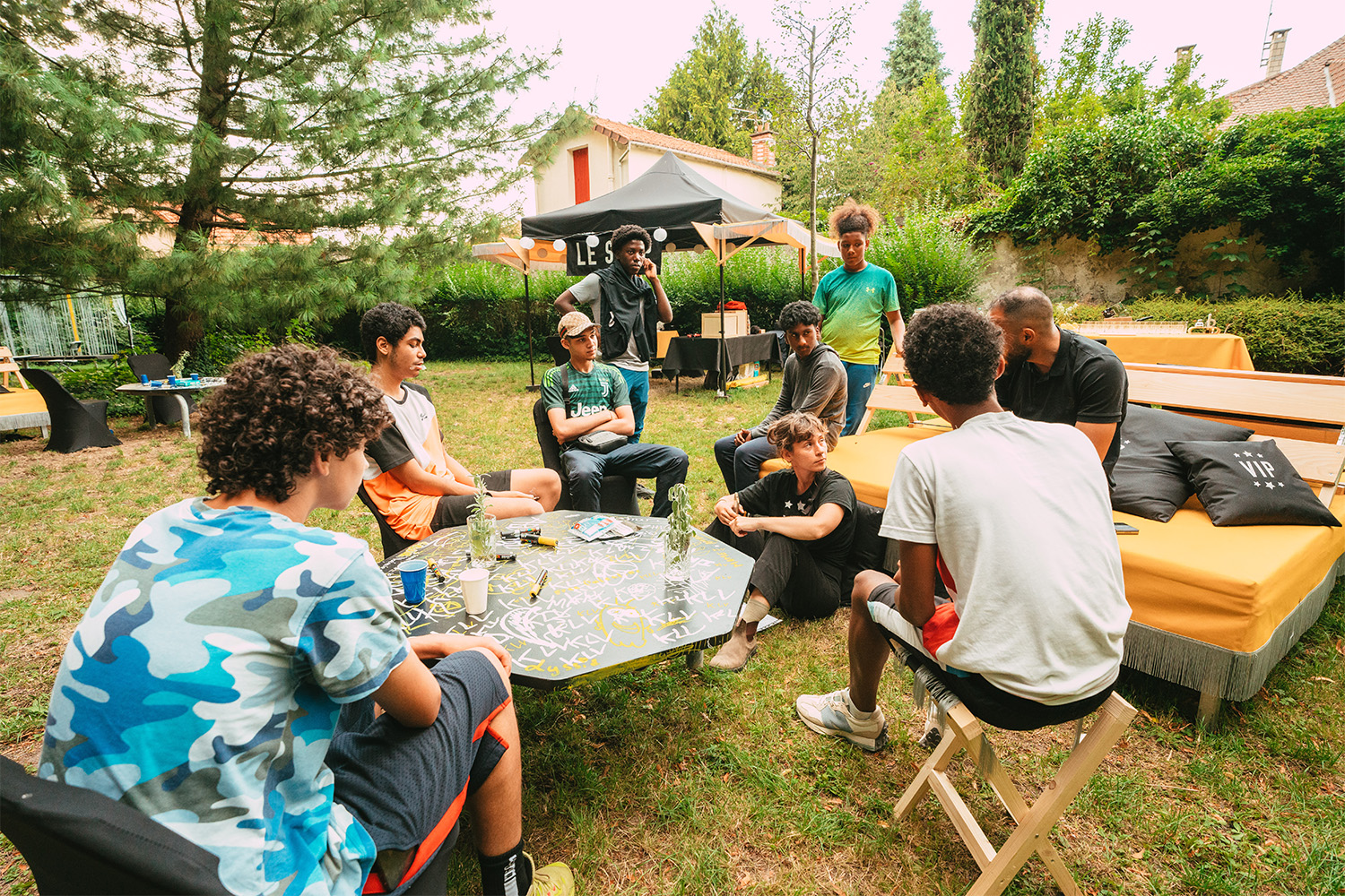 Le Carré VIP est un espace calme, serein, environné de nature. C’est un lieu à soi, un QG réservé aux jeunes où on peut se poser, chiller sur les canapés, scroller, écouter de la musique, faire la fête, se prendre en vidéo, être ensemble, faire beaucoup avec pas grand chose, laisser sa trace, floquer son bob, goûter des pâtisseries, partager des pizzas, préparer son cocktail, construire du mobilier et changer l’aménagement du lieu pour s’y sentir encore mieux. On peut privatiser le Carré avec son groupe d’ami.es et choisir sa programmation.