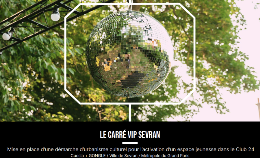 Le Carré VIP est un espace inclusif sevranais inédit et sur mesure permettant d’inviter et d’accueillir les jeunes de 14 à 25 ans. Il s’agit d’un micro-aménagement dédié à la jeunesse qui s’installe aussi bien dans l’espace public qu’au sein d’une structure. Il a été pensé avec le groupe d’artistes, de sportives et de chercheuses GONGLE.