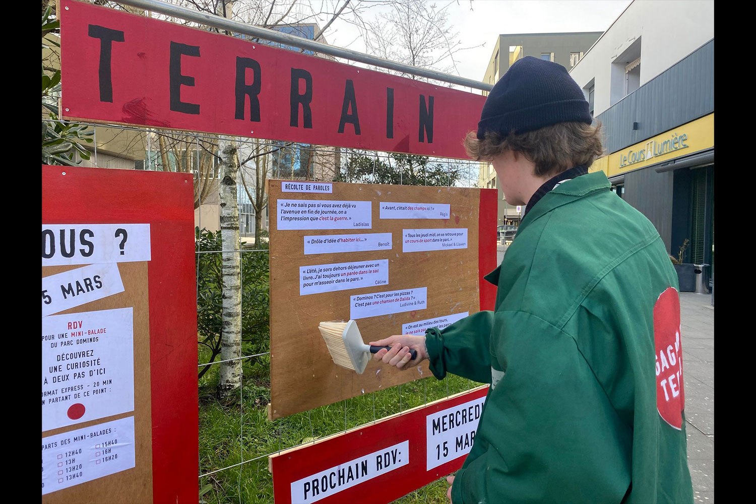 Pendant 6 mois, nous avons enquêté sur le secteur Dominos du quartier de la Courrouze, un espace en cours d'aménagement qui fait le grand écart entre site d'affaires et micro forêt urbaine. Cette 4ème édition de Gagner du terrain jouée aux côtés du collectif Les Animé.e.s nous a permis de préfigurer le futur parc des Dominos et de favoriser l'appropriation des espaces publics par celles et ceux qui le parcourent au quotidien.
