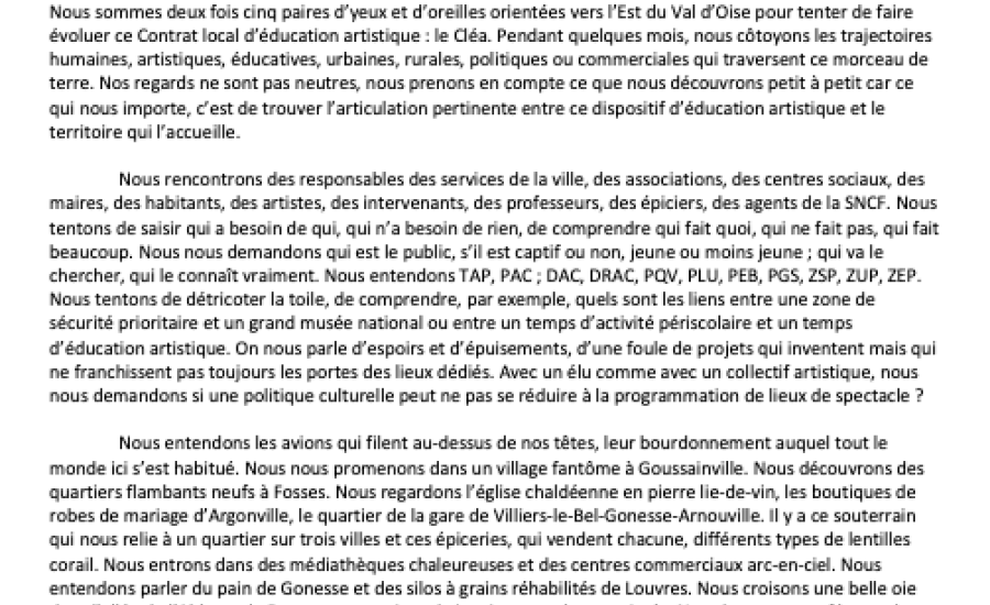 Ancrer les résidences-missions sur le territoire en les orientant autour d’une thématique liée à des questions spatiales et d’usages ; constituer un groupe transversal (culture, sport, espaces publics, vie associative ou action sociale) pour accueillir les artistes. Avec les villes de Fosses, Louvres et Marly-la-Ville, nous choisissons de travailler sur la mobilité. Pendant trois jours d’ateliers, nous sommes une dizaine, agents des villes, éducateurs, habitants et artistes à prendre le temps de se connaître, de partager nos pratiques, d’observer la gare de Fosses et ses usages, avant de « co-construire une mini action artistique ». Nous l’appelons « RER dépaysement », elle consiste à inventer des tickets de RER alternatifs pour des chemins de traverse. Nous les distribuons un petit matin de mars devant la gare de Fosses.