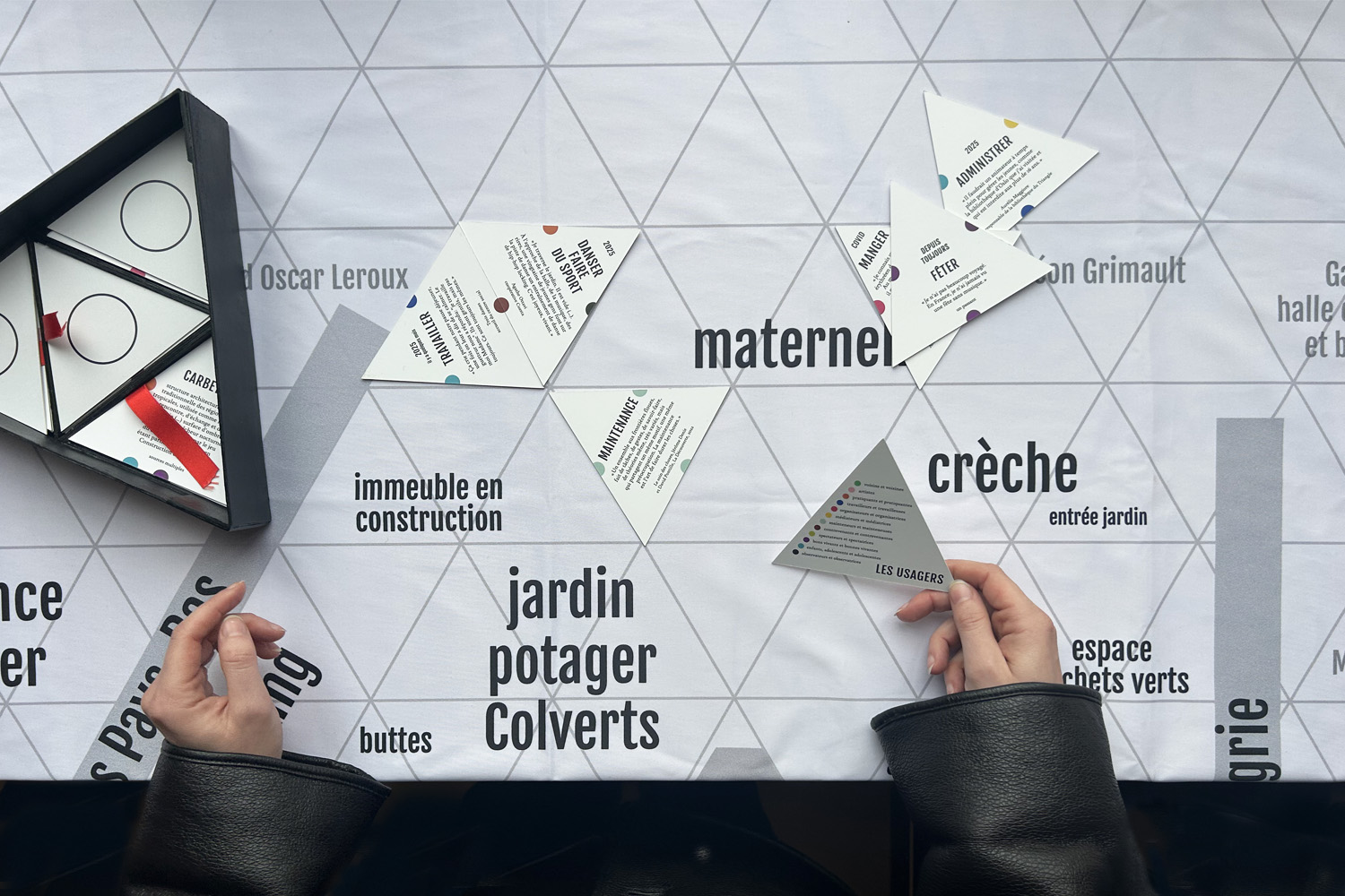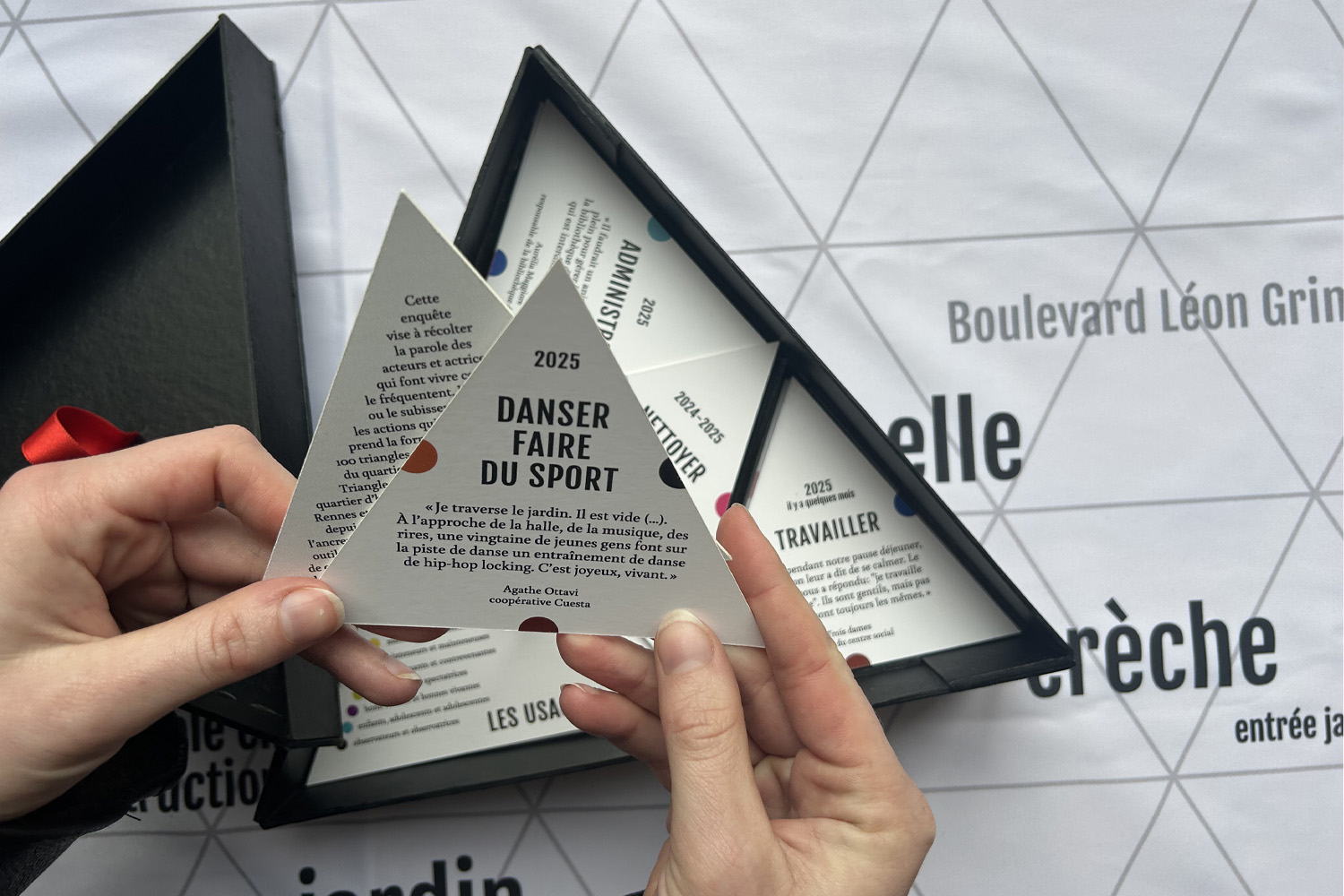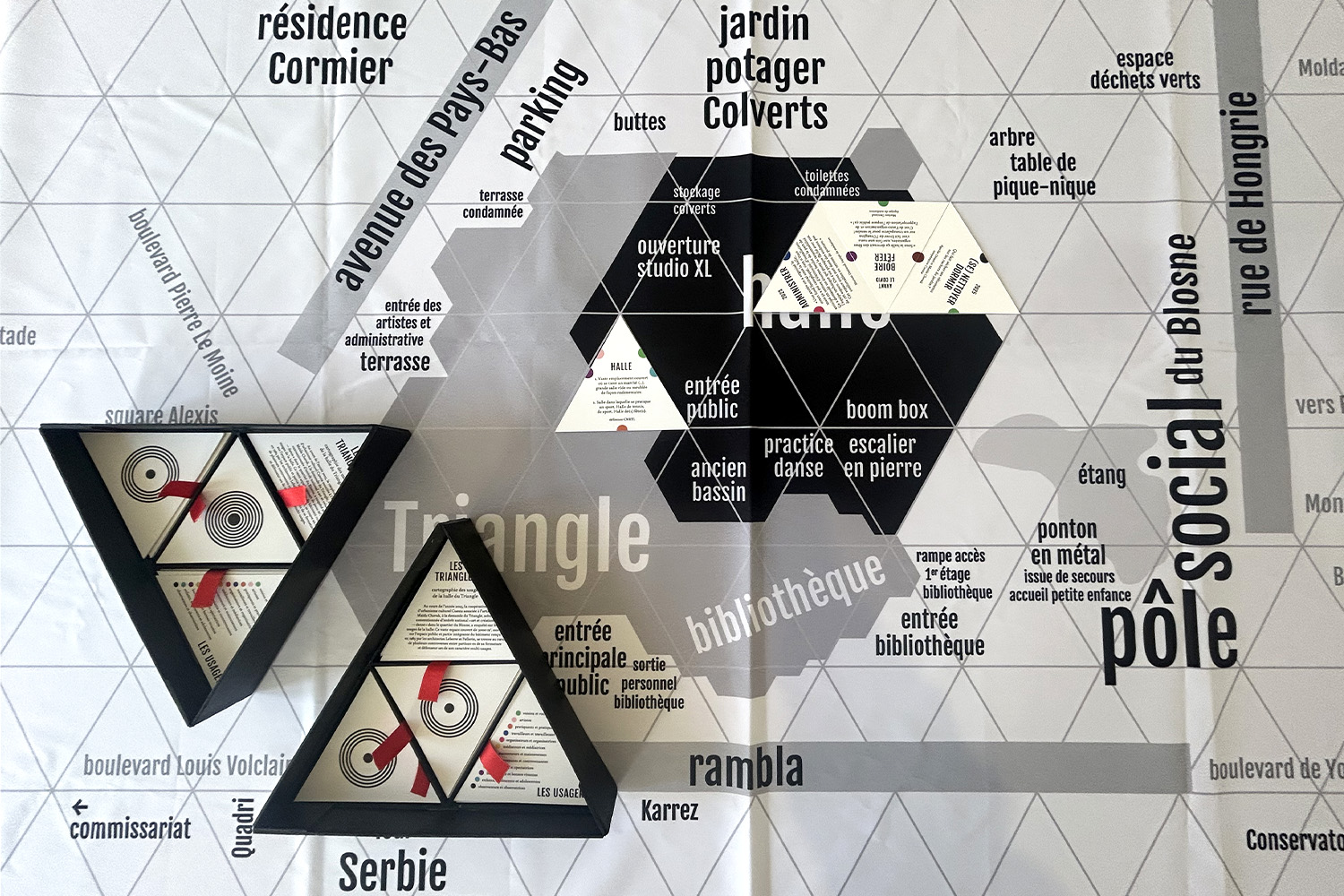 Cette enquête vise à récolter la parole des acteurs et actrices qui font vivre ce lieu, le fréquentent, le côtoient ou le subissent et à décrire les actions qui s’y déroulent. Elle prend la forme d’un jeu composé de 100 triangles et d’une nappe-cartographie du quartier. Ce jeu tente de réinscrire Le Triangle dans sa double histoire : celle d’un quartier d’habitat populaire situé dans la ZUP sud de Rennes et celle de l’évolution des politiques culturelles depuis les années 70 à aujourd’hui. Il cherche aussi à l’ancrer dans sa géographie proche et lointaine. Il se veut un outil pour éclairer les décisions qui seront prises sur l’avenir de cette halle