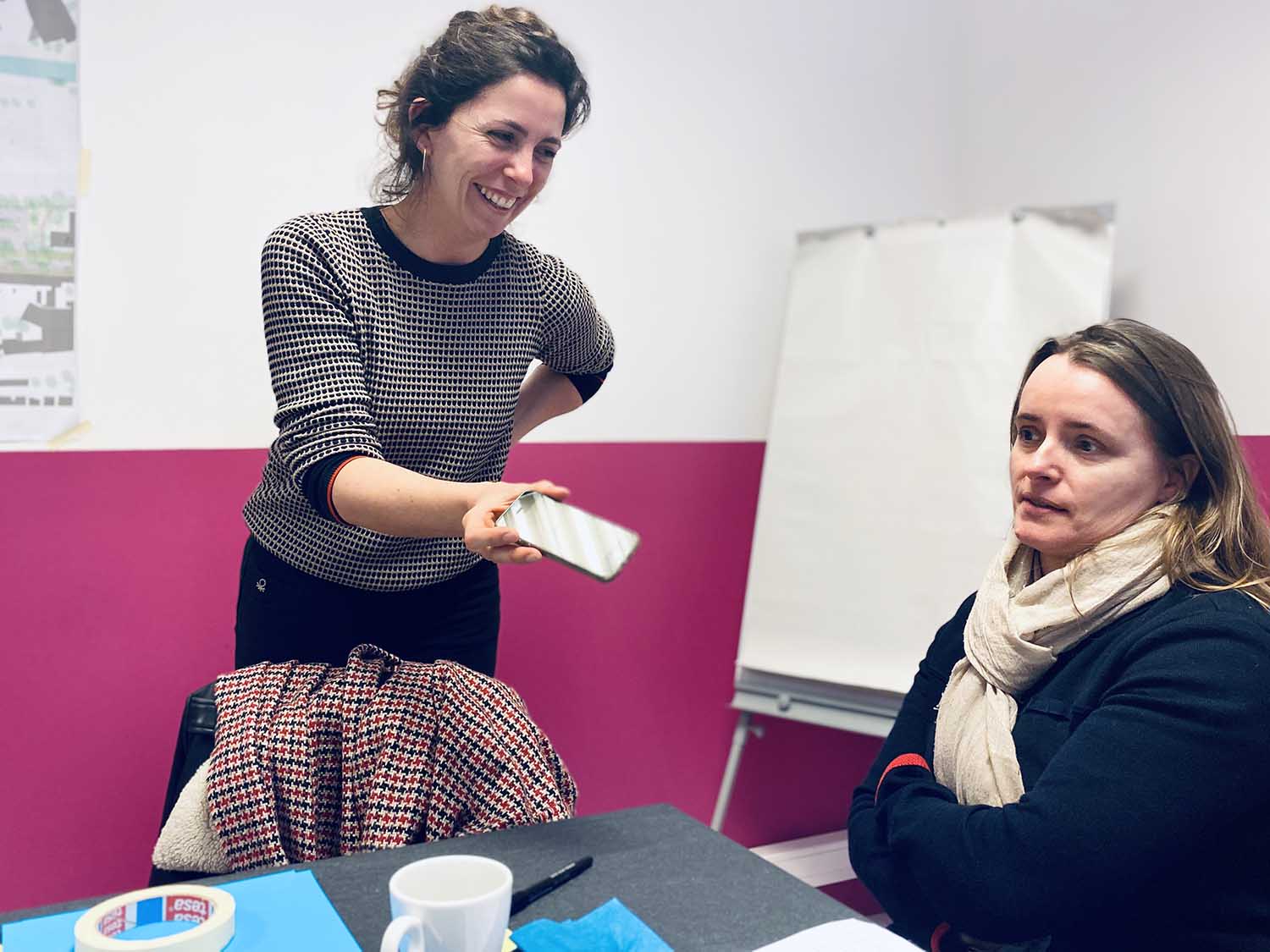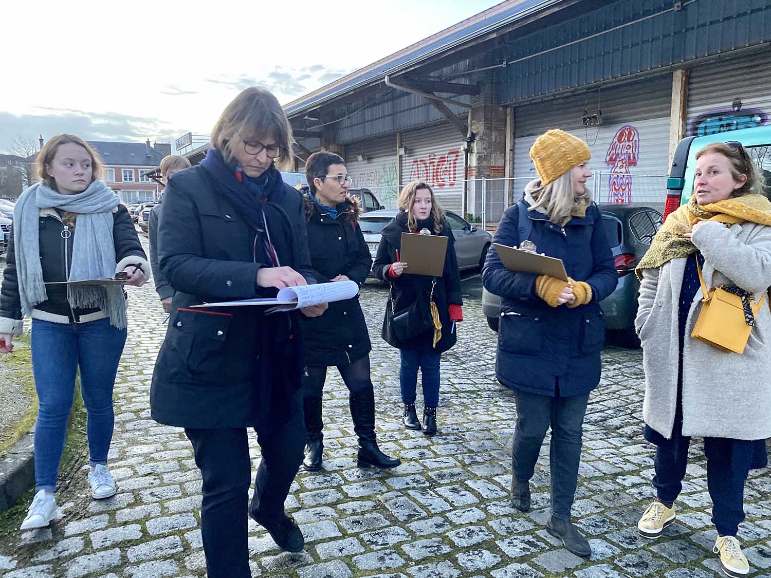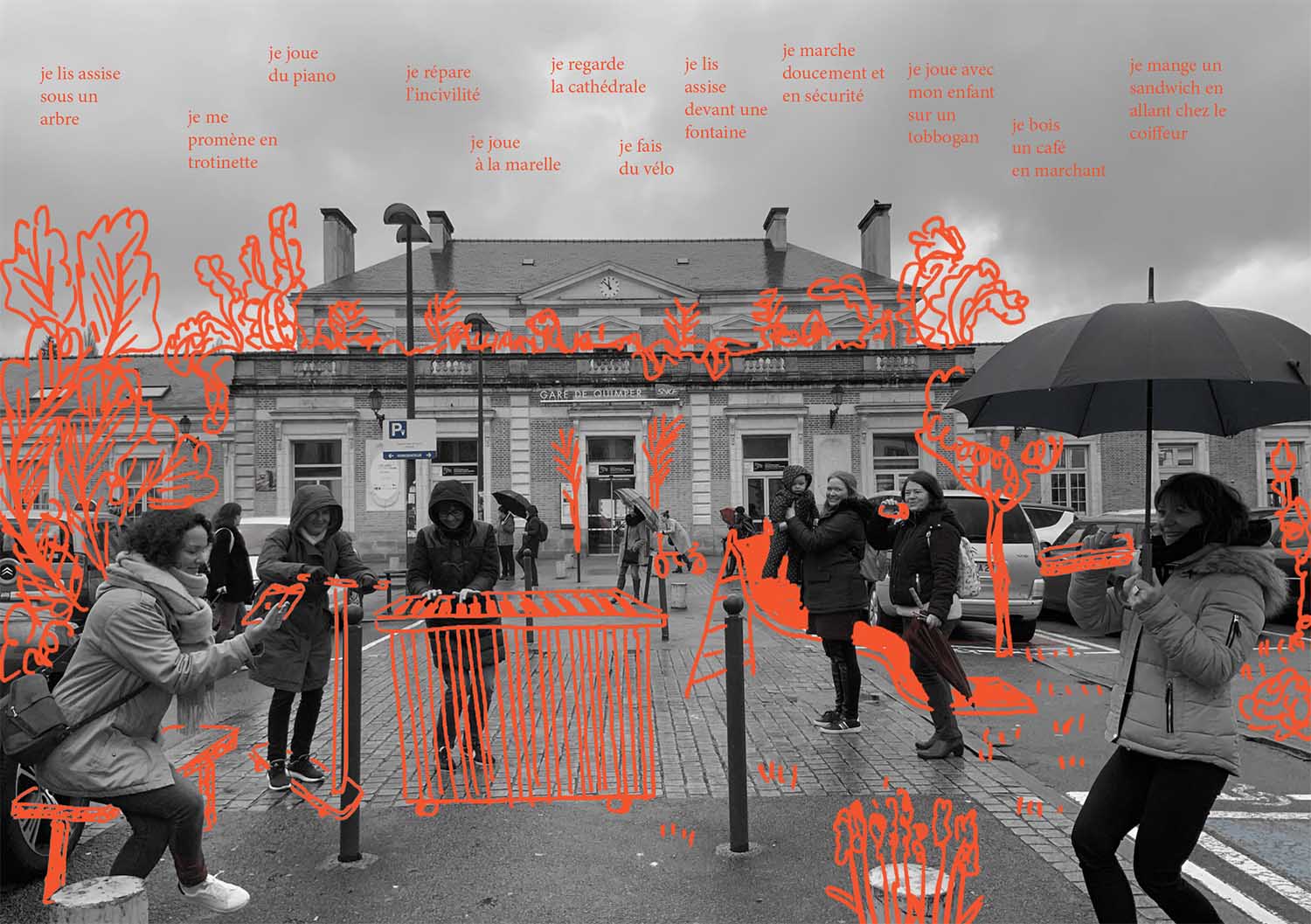 Connaissant le projet d’aménagement dans les moindres détails et bien connectées avec le quartier grâce à notre projet Gare-Parc, nous avons conçu et mis en œuvre une expérimentation inspirée « des marches exploratoires des femmes » et de protocoles des artistes associés de Cuesta, notamment « Plateau-Photo » de GONGLE afin de recueillir des données sensibles sur l’aménagement, mais aussi les modes de gestion et d’animation de ces espaces publics.