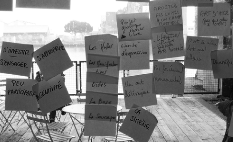 Premier point d’étape : un workshop réunissant une soixantaine de personnes, élus, opérateurs culturels, urbanistes, acteurs touristiques, artistes, acteurs sociaux, médiateurs culturels et urbains… que nous embarquons dans l’aventure du montage d’une prochaine inauguration d’un parcours d’arts publics à Saint-Nazaire. Avec eux nous définissons l’art public à Saint-Nazaire qui devient alors pluriel. Nous partageons des expériences venues d’ailleurs qui renouvellent notre regard sur l’art dans l’espace public, l’enrichissent de valeurs sociales, environnementales, politiques, élargissent ces formats et cadres de mise en œuvre. Ensemble, nous imaginons le parcours, les contenus de cette inauguration : ce qui existe, ce qu’il faut inventer. Nous posons les bases de la traversée « On ne part pas de 0 !, du km 0 à la plage de M. Hulot » et réinventons le format de l’étude.