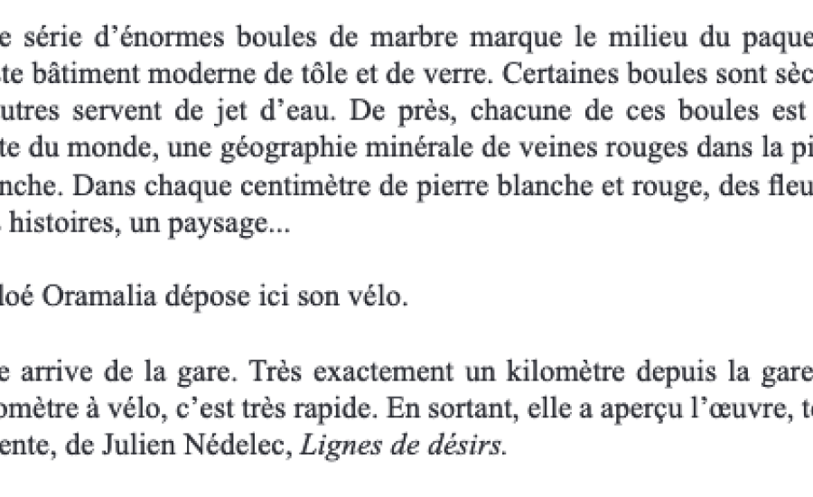 Nous cherchons à faire comprendre par une approche sensible et située les orientations de ce futur programme et imaginons un récit qui le donnera à voir. Nous actons d’un tracé et constituons une carte mêlant œuvres réelles et imaginaires. Avec la direction de la culture et les élus, nous imaginons comment le mettre en œuvre, quel rôle la communauté d’arts publics y jouera, quelles étapes sont à prévoir. Le 13 juillet 2019, nous performons la traversée. Guidés par le documentaliste de l’espace, une partie de la communauté et des habitants sont invités à parcourir en vélo la ville de Saint-Nazaire marquant des étapes pour inaugurer les futures œuvres et en partager les récits.