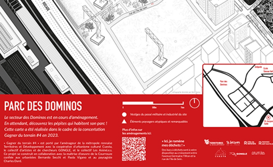 Pendant 6 mois, nous avons enquêté sur le secteur Dominos du quartier de la Courrouze, un espace en cours d'aménagement qui fait le grand écart entre site d'affaires et micro forêt urbaine. Cette 4ème édition de Gagner du terrain jouée aux côtés du collectif Les Animé.e.s nous a permis de préfigurer le futur parc des Dominos et de favoriser l'appropriation des espaces publics par celles et ceux qui le parcourent au quotidien.