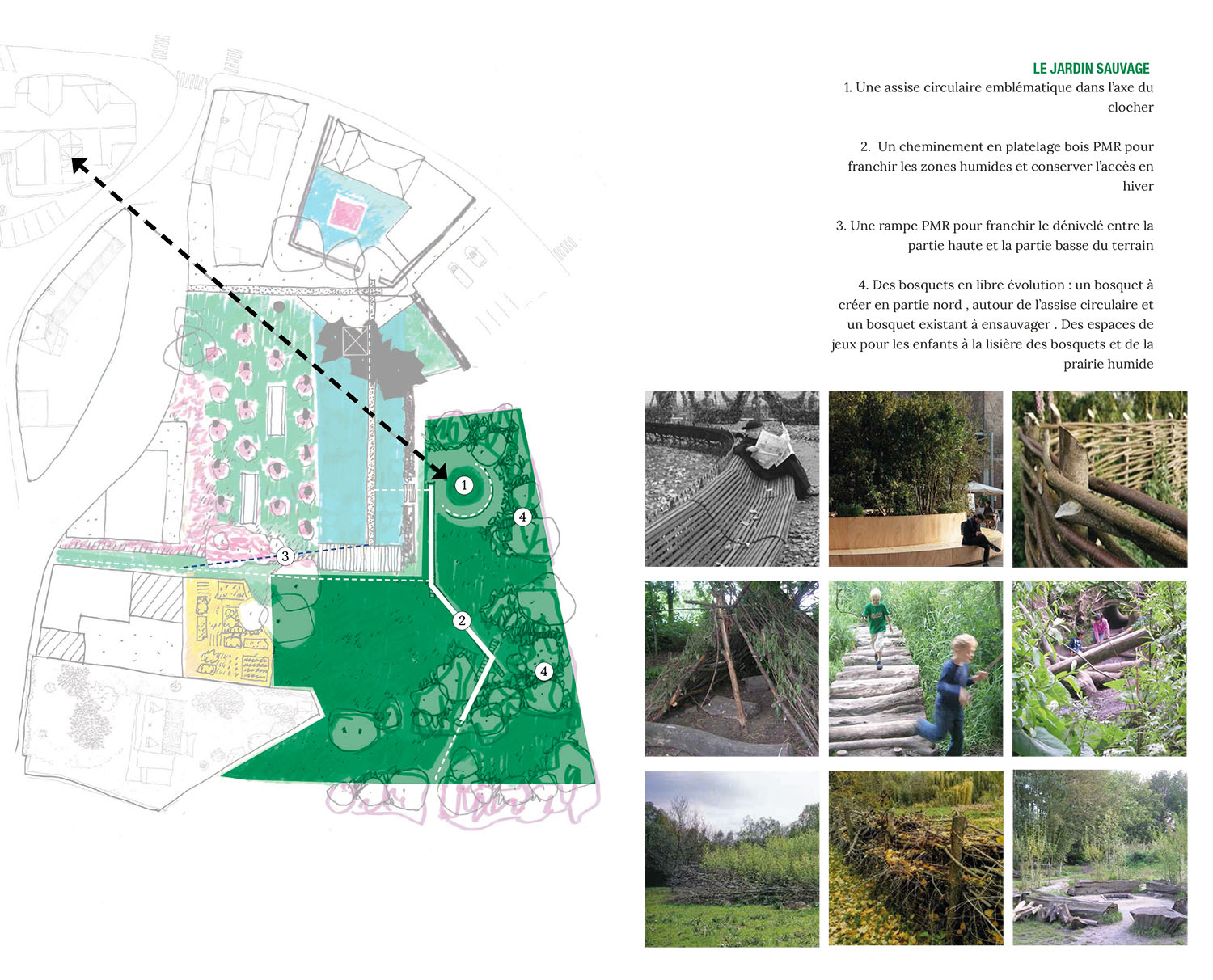 La friche paysagère de 9000 m2 en plein cœur de la petite commune de Breteil de 3700 habitants était censée accueillir un lotissement de petits immeubles. Les nouveaux élus ont décidé de déplacer ce projet et de sauver cet espace à la biodiversité riche en créant la place publique, l’espace commun qui manquait à la commune. Pour construire ce projet, il fallait écouter les habitants et acteurs, leurs envies, leurs attentes, ce que nous avons fait au cours d’ateliers. Il fallait également arpenter l’espace, relever les espèces, les variations de terrain, les points de vue. En ressort une esquisse partagée avec les habitants et acteurs de la commune. La seconde phase du projet vise la réalisation d’une partie du jardin en s’appuyant notamment sur des chantiers participatifs pour réaliser une partie des ouvrages, des plantations et un kit festif construit avec les habitants qui sera utilisé les jours de fête.