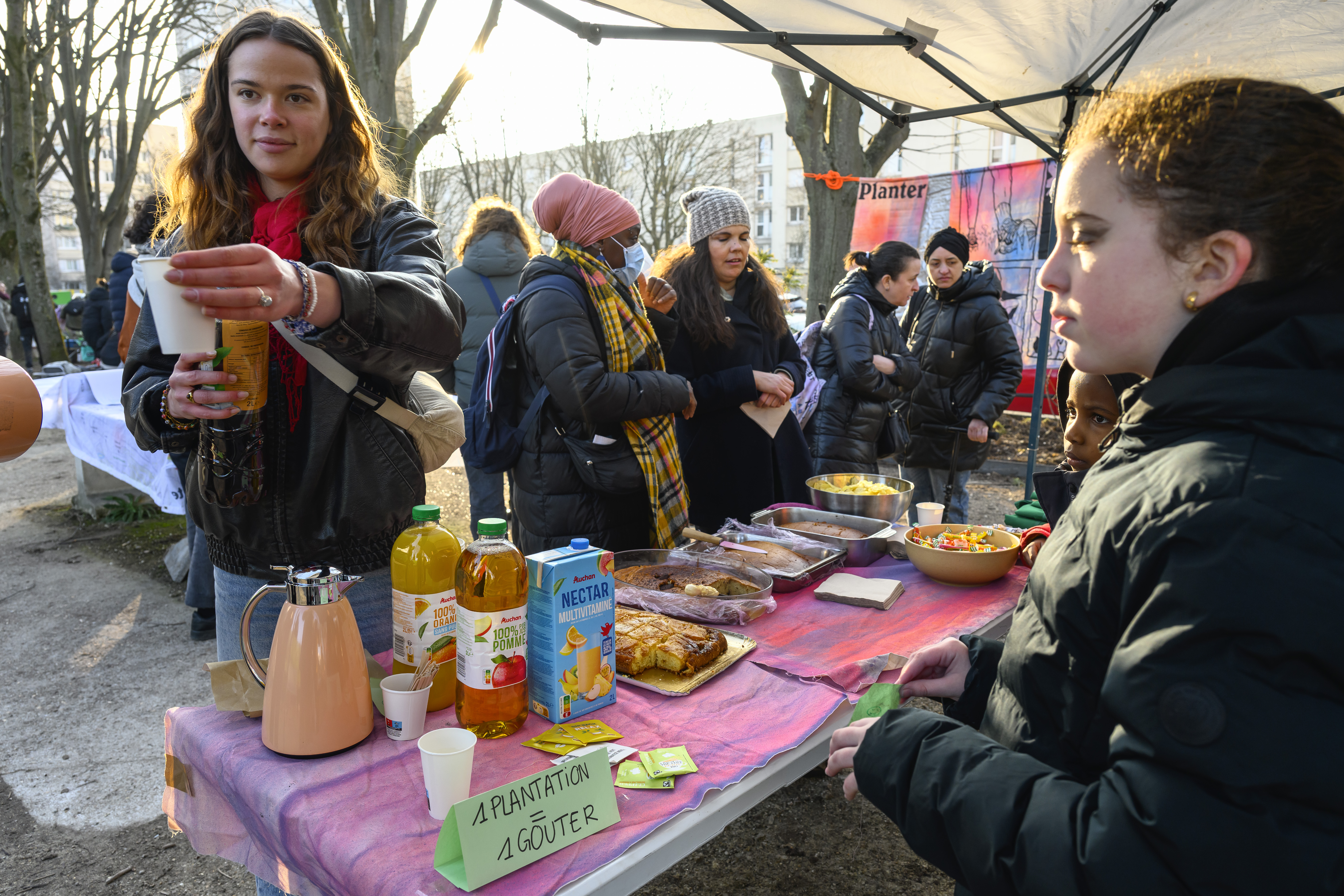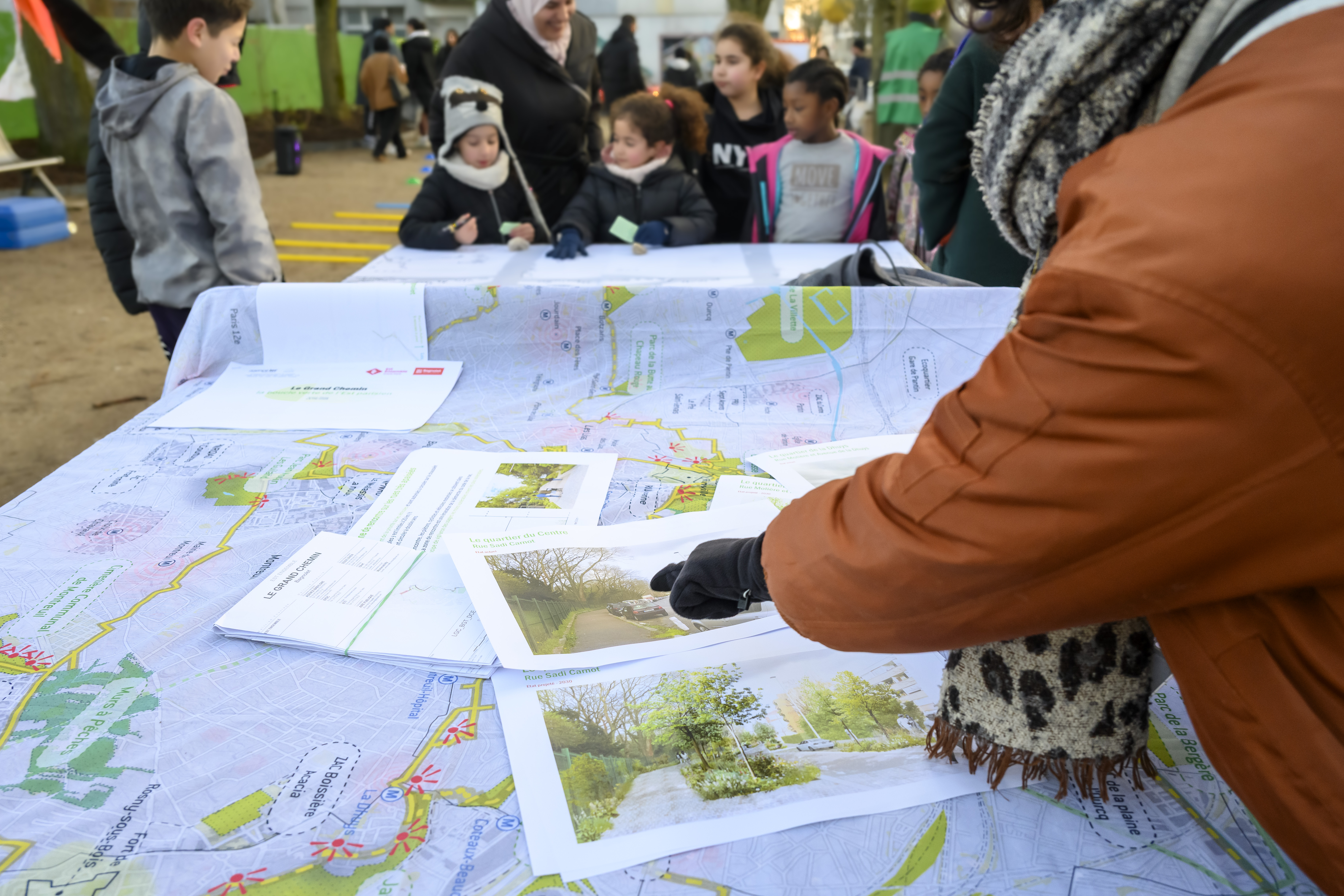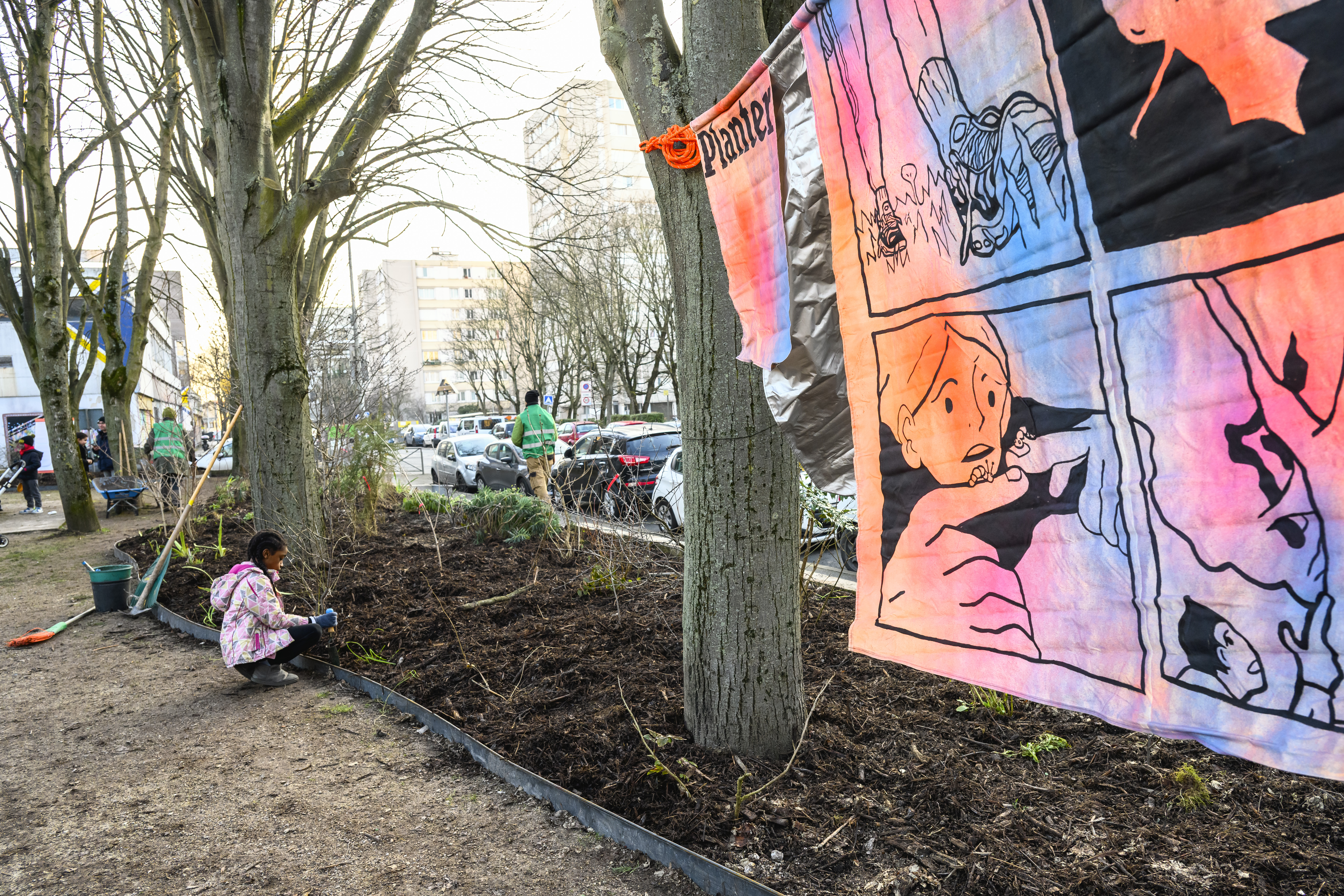 En 2025, une action pilote à Bagnolet permet de faire exister dès à présent Le Grand Chemin rue Pierre et Marie Curie, dans le quartier des Malassis. Avec le Collectif ETC et l’artiste Maïda Chavak, nous lançons une démarche participative pour accompagner de nouveaux usages sur le parvis de l’école Henri Wallon. A partir de la présence emblématique de grands arbres, nous tissons un récit autour du jardin forestier et lançons un chantier ouvert de plantations. Des partenariats sont noués avec les services de la ville, le centre social, les associations du quartier, l’école, pour se projeter dans la gestion de ce futur espace planté au cœur d’un quartier en complète transformation urbaine.